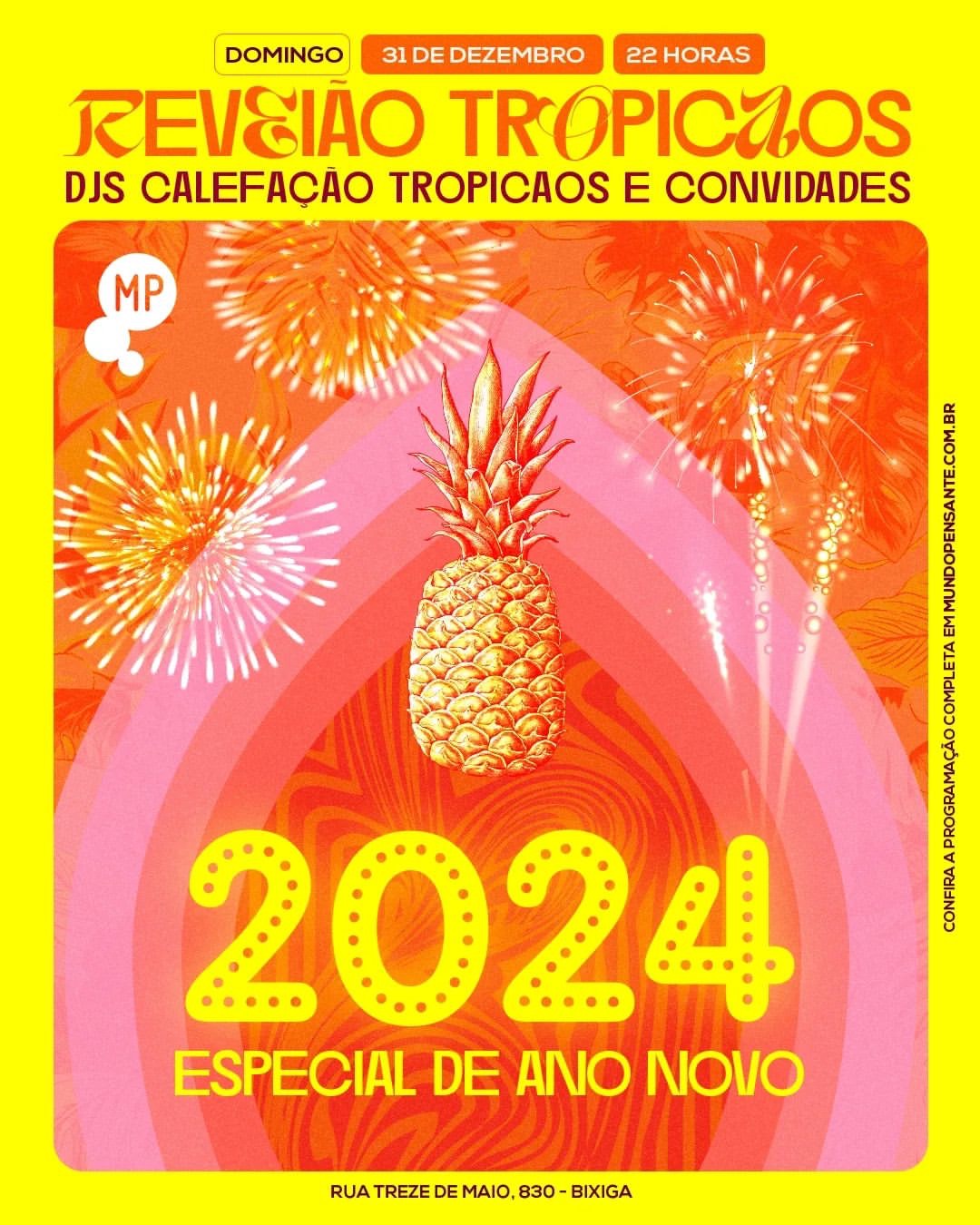 Em clima de virada apocalíptica, o Reveião Tropicaos no Mundo Pensante promete agitar a entrada em 2024 de maneira única. Sob o comando da Calefação Tropicaos e DJs convidados, a pista mais deliciosa da cidade será o palco para celebrar o novo ano com muita animação.