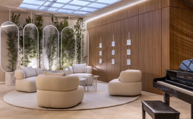 Em uma homenagem ao maestro João Carlos Martins, a profissional ressalta sua paixão pela música, no espaço onde um piano se destaca entre elementos em curvas, biofilia, tons leves e iluminação natural.