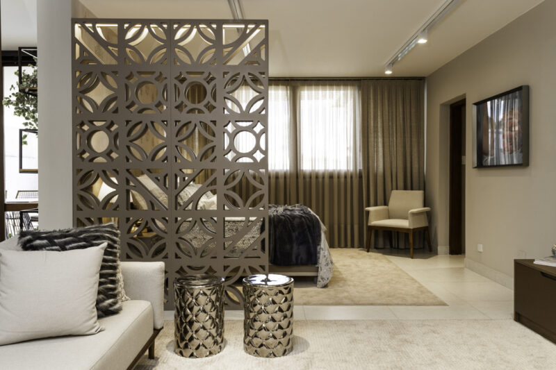 Em projetos residenciais, os painéis de muxarabi conferem continuidade aos espaços, garantindo um conforto visual como solução para salas, quartos e espaços de interação.