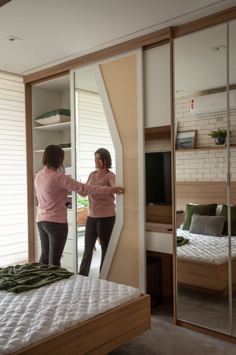 Outro ponto que, às vezes, passa despercebido na hora de conceber o layout de um quarto compacto são as portas. No dia a dia, pode ser bastante incômodo ter que lidar com a versão de abertura convencional, que ‘consome’ uma grande área quando está aberta. Foi por isso que, na hora de idealizar seus projetos, Bruno costuma optar por uma combinação imbatível, o uso de folhas de correr com espelho, que ainda resulta em amplitude.