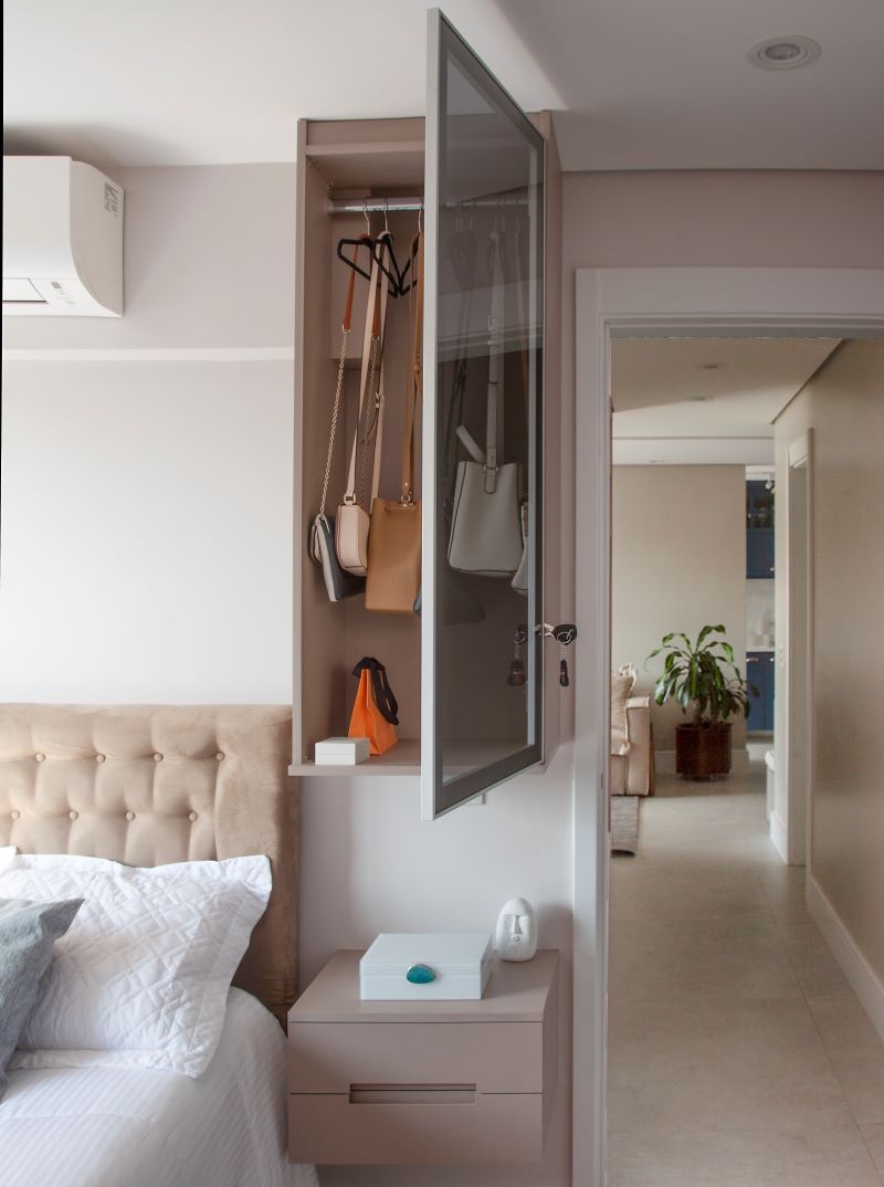 A praticidade ao lado da cama não precisa se limitar à mesinha de cabeceira. Pelo contrário: esta solução desenvolvida pelo BMA Studio mostra que é possível maximizar cada centímetro de um quatro. Neste apartamento, o armário colocado junto à parede foi perfeito para guardar as bolsas da moradora de forma organizada, sem arriscar algum dano ao material, pois elas ficam perfeitamente esticadas no cabide. O lado do marido também conta com o seu próprio móvel, que recebe os seus itens pessoais. Mais uma vez, a superfície espelhada da porta reflete a luz e melhora a noção de espaço.