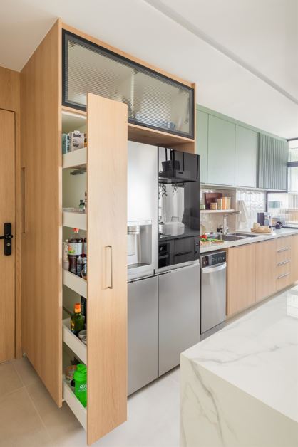 Gavetas com divisórias ajustáveis, portas basculantes com pistão a gás, gavetões amplos e cantoneiras giratórias tornam o uso mais rápido e funcional. Para Bruno Moraes, a personalização é indispensável: quem cozinha com frequência, por exemplo, se beneficia de gavetas exclusivas para temperos, enquanto cozinhas compactas pedem divisórias específicas para panelas e tampas. É esse equilíbrio entre beleza e funcionalidade que faz o projeto ganhar vida.