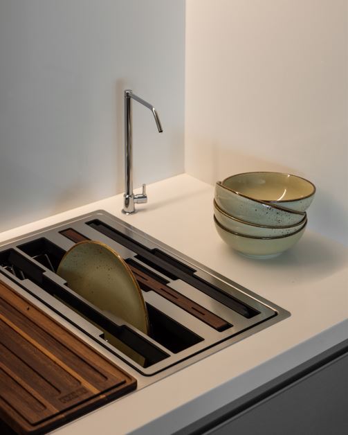 As calhas úmidas substituem o escorredor tradicional e mantêm a bancada sempre limpa. Embutidas como a cuba, levam a água diretamente para o esgoto e permitem inserir suportes para louças, tábua e dispenser.