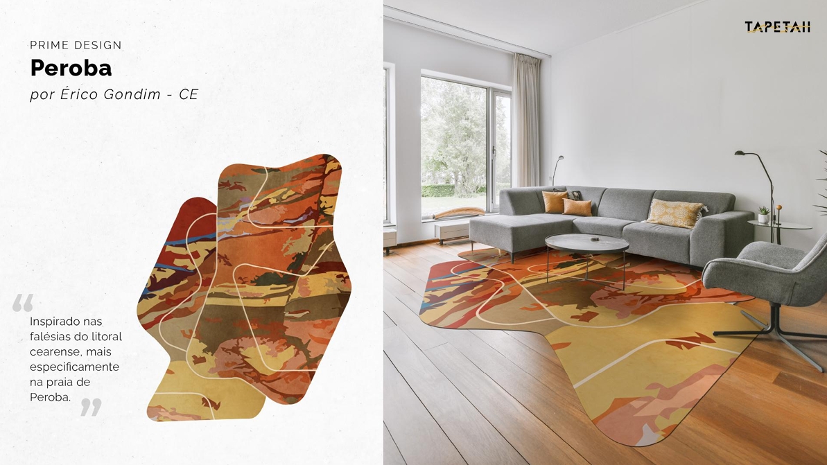 Inspirado nas falésias do litoral cearense, mais especificamente na praia de Peroba, no município de Icapuí, o tapete Peroba procura representar um recorte da beleza natural multicor dessa formação rochosa e arenosa, dia a dia moldada e polida em formas orgânicas pelo vento, pelas águas do mar e pelos raios do sol tropical. As falésias cearenses tem sua formação rica em areia colorida, que faz parte da cultura artesanal local e especialmente da vivência e memória afetiva do designer Érico Gondim.