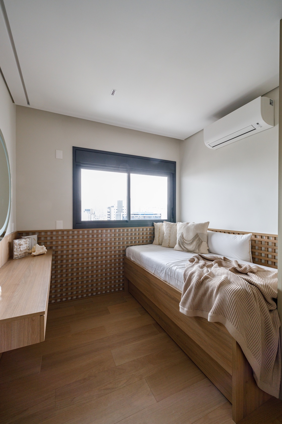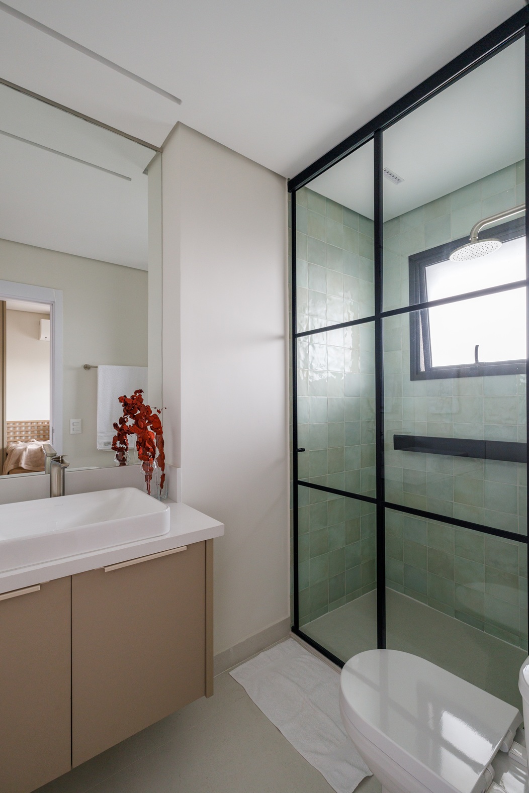 Na área íntima, a suíte principal exibe cabeceira em muxarabi retroiluminada, armário com portas de vidro e papel de parede em linho — um refúgio elegante e sereno. O quarto das filhas segue a mesma linguagem, com acabamentos suaves e penteadeira iluminada. Os banheiros reforçam a atmosfera de spa urbano: o principal, revestido do piso ao teto, traz duas cubas e cabines independentes; o secundário aposta em tons de verde suave e linhas puras.