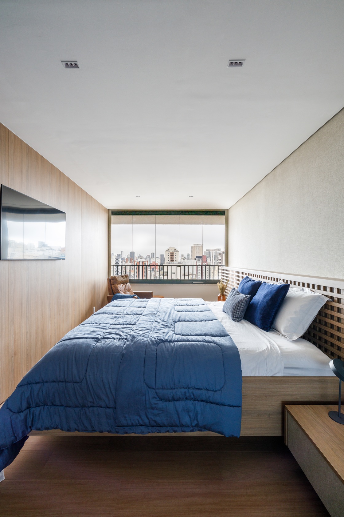 O ponto de partida foi o desejo do morador por espaços fluidos, acolhedores e com automação completa, sem abrir mão da estética refinada. A planta original foi mantida, mas ganhou amplitude e harmonia graças à integração das sacadas à sala e à suíte, sem alterações estruturais. O resultado é um lar luminoso e conectado, onde o uso da madeira em painéis, forros e mobiliário sob medida da Kitchens aquece a linguagem minimalista.