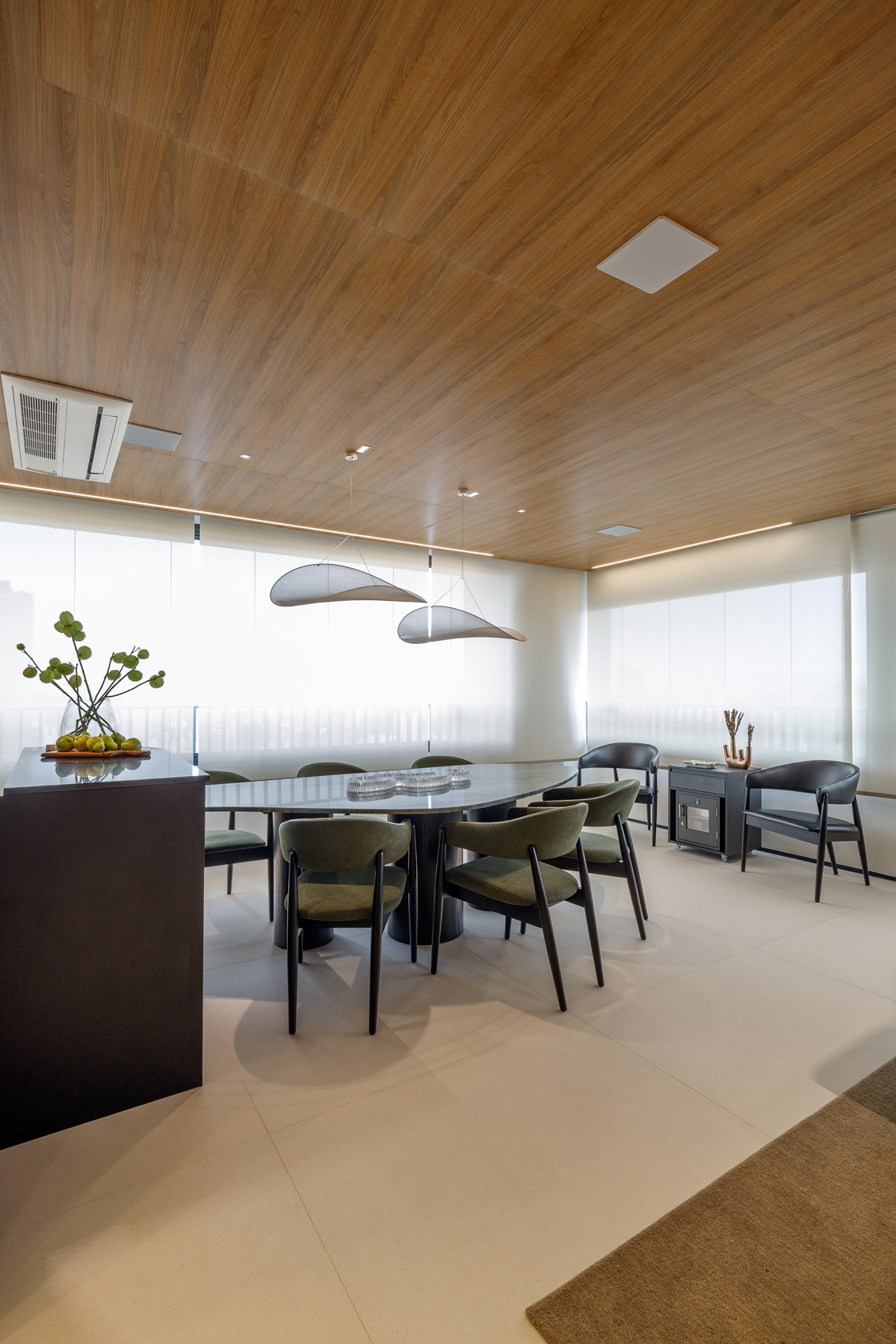 Na área social, a integração entre sala de estar, varanda gourmet e jantar cria uma atmosfera fluida e convidativa, ideal para receber. A icônica poltrona Mole, de Sérgio Rodrigues, dialoga com móveis autorais de tampos orgânicos e iluminação cênica, que transforma o clima conforme o momento.