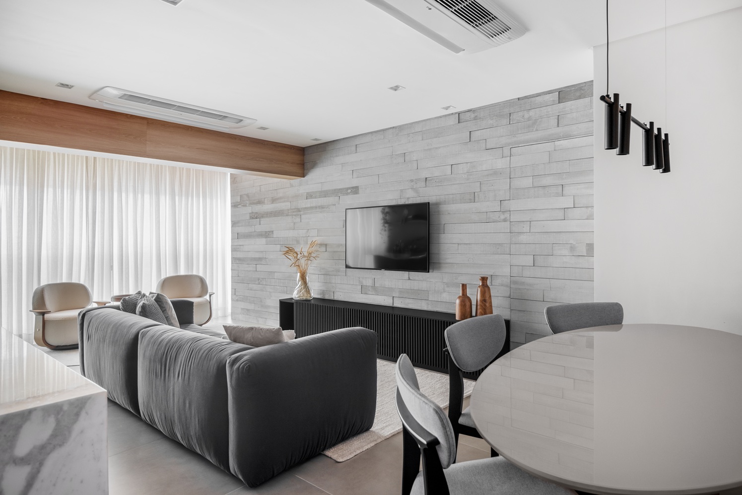 Revestimento cimentício sala Scala 10 Cinza 10×100 Gauss Revestimentos