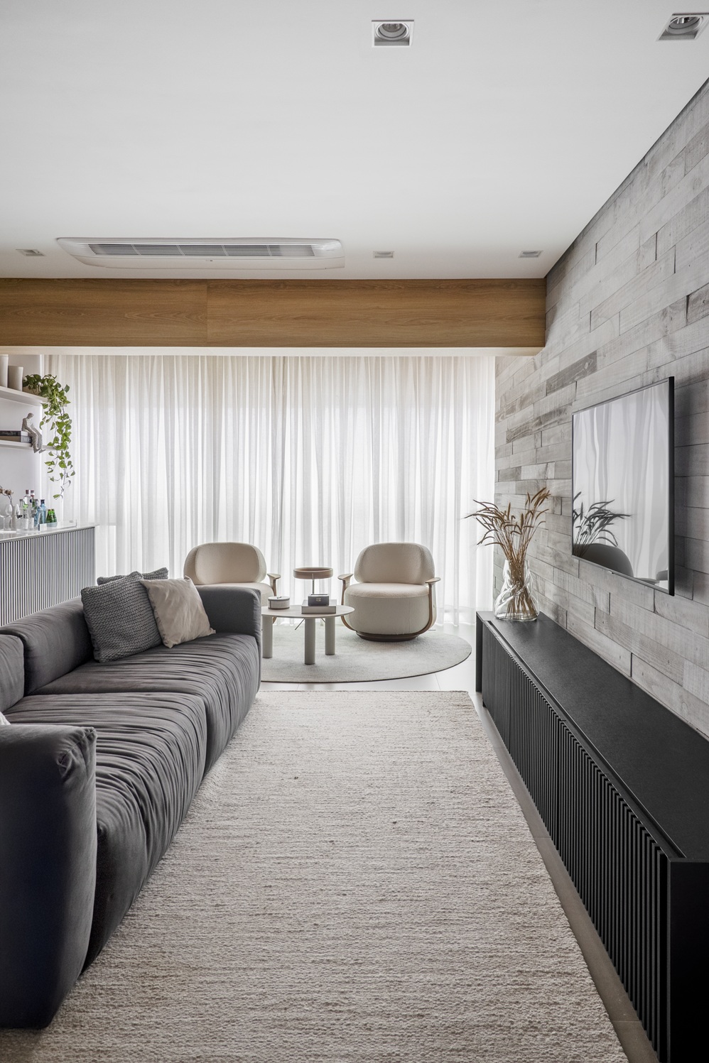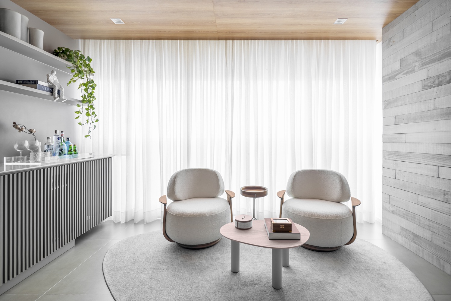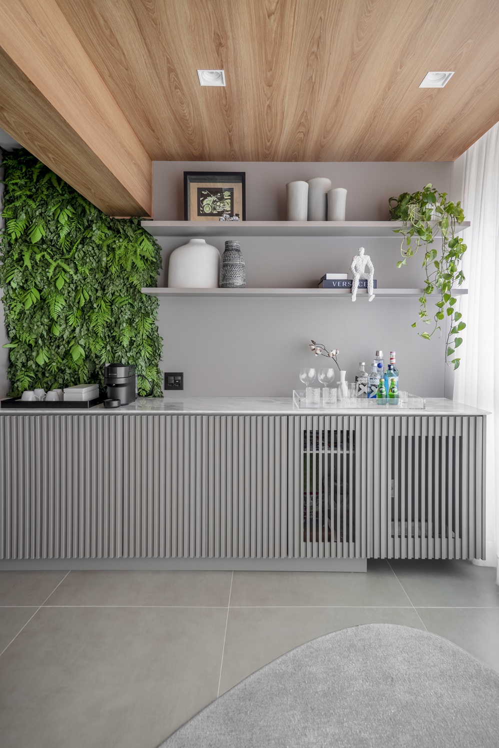 Entre os destaques do living está o espaço do bar, criado no local onde antes ficaria a varanda gourmet. Pensado como um ambiente de descompressão, ele conta com bancada desenhada sob medida, portas em madeira ripada e uma pequena parede viva que introduz elementos de biofilia ao projeto. A presença de plantas contribui para tornar o espaço mais acolhedor e dinâmico.
