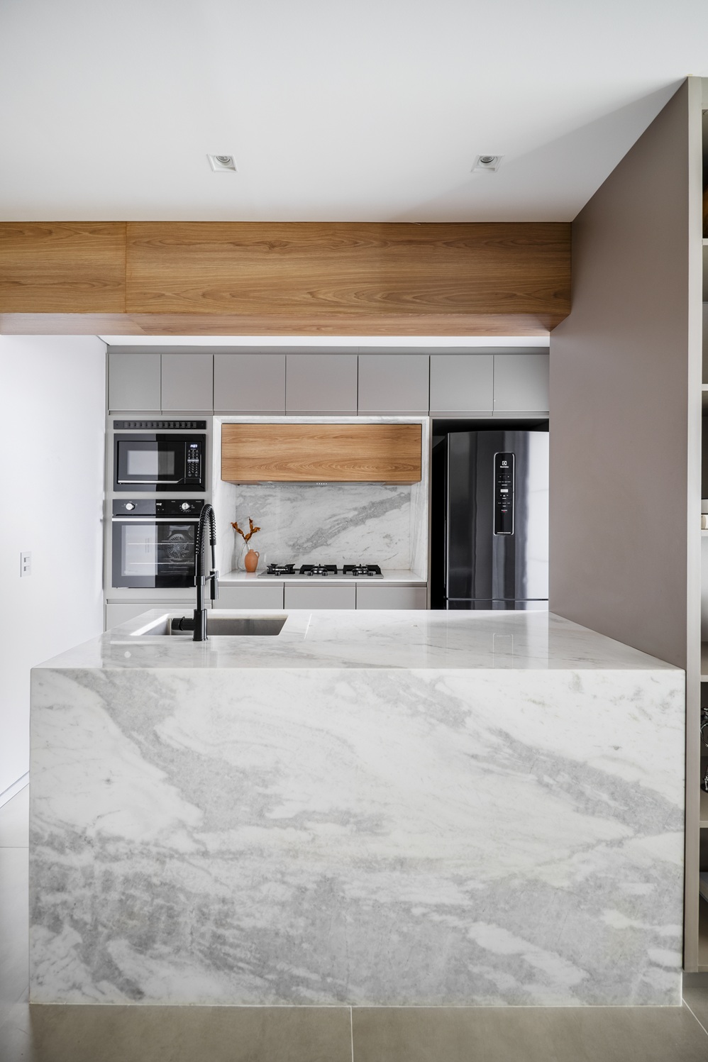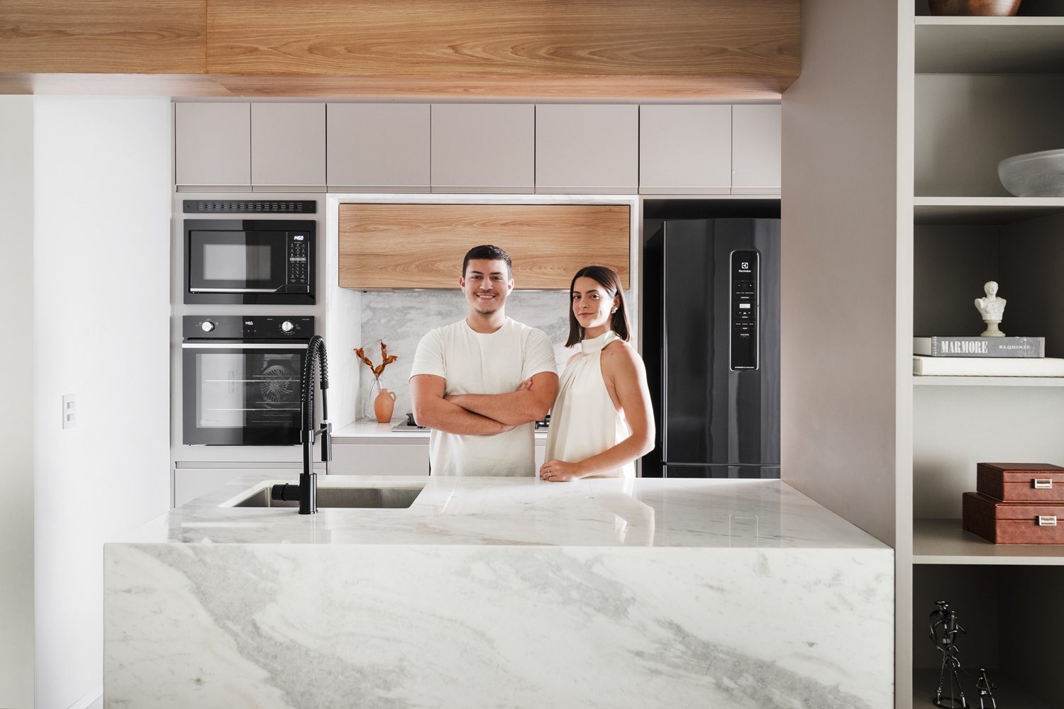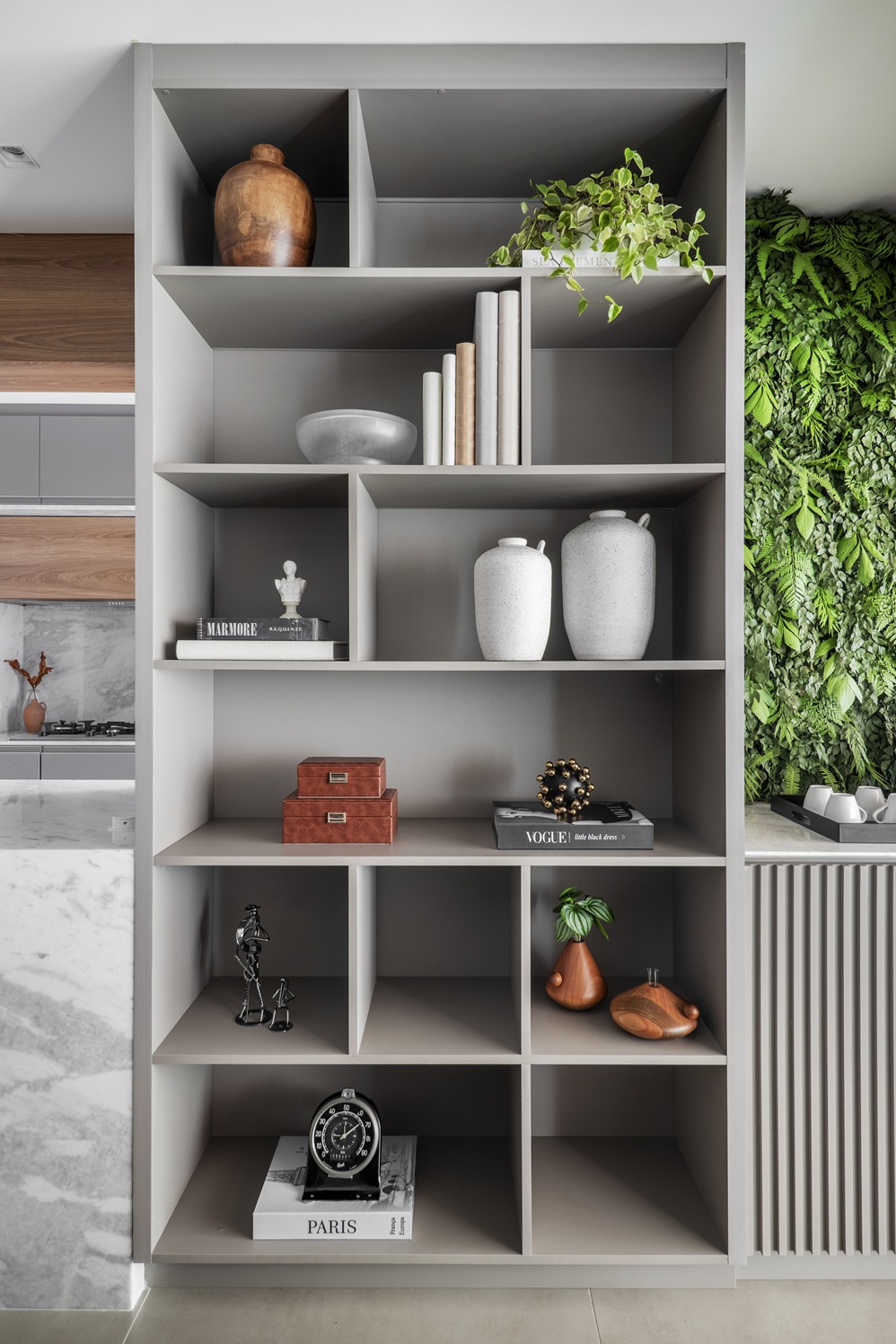 Outro elemento marcante é a estante com nichos de diferentes dimensões, que organiza livros, objetos e plantas enquanto cria volumetria e movimento na parede. O desenho segue em continuidade até a bancada da cozinha, executada em mármore Paraná, que reúne área de preparo e cuba, reforçando a integração entre os ambientes.