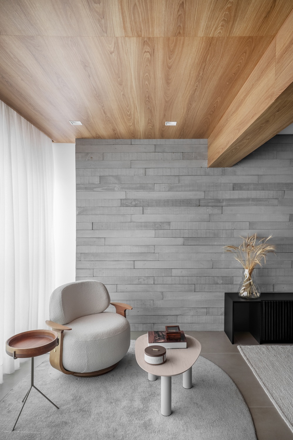 A paleta de cores, predominantemente em tons de cinza e preto, reforça a estética moderna e sóbria do espaço. Para equilibrar a composição e trazer aconchego, a madeira aparece em pontos estratégicos — em revestimentos, mobiliário e detalhes arquitetônicos — criando contraste de texturas e aquecendo visualmente o ambiente.