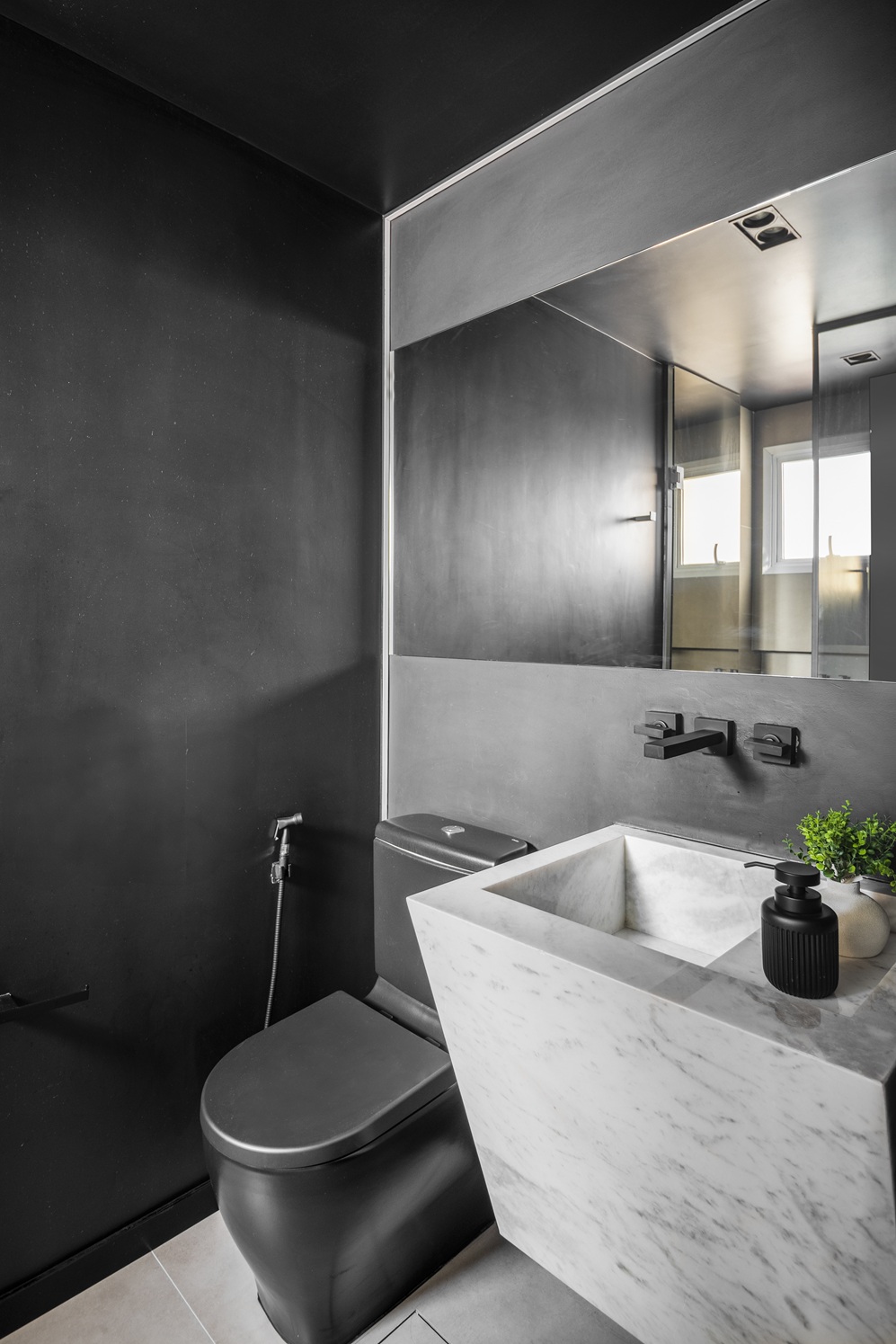 O lavabo revela uma estética ousada e sofisticada. O preto domina paredes e teto em um efeito de color block, enquanto metais e louças no mesmo tom reforçam a identidade do ambiente. A cuba esculpida em mármore Paraná, com desenho assimétrico, torna-se o elemento de destaque, complementada por nichos embutidos que acomodam objetos e aromatizadores.