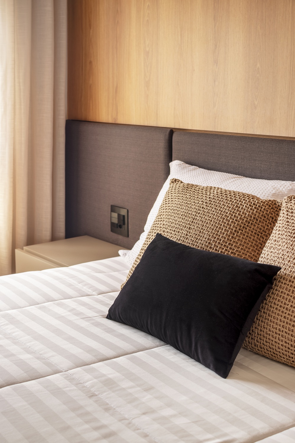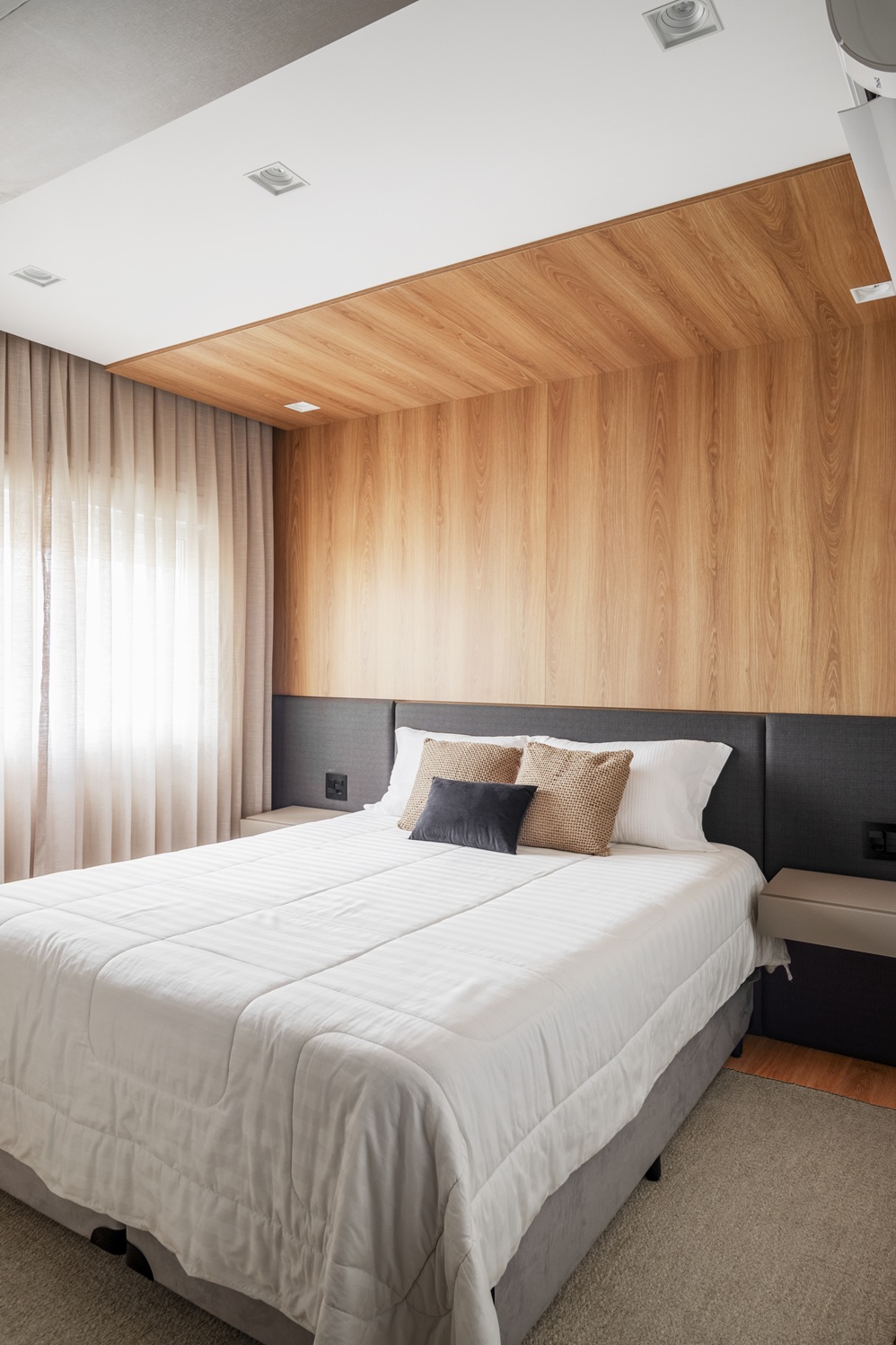 Na área íntima, a suíte mantém a linguagem visual do restante do apartamento, mas com predominância da madeira, que reveste a parede da cabeceira e se estende parcialmente pelo teto, criando uma atmosfera mais intimista. O mobiliário segue o princípio do minimalismo, com cabeceira estofada preta e mesas laterais desenhadas sob medida.