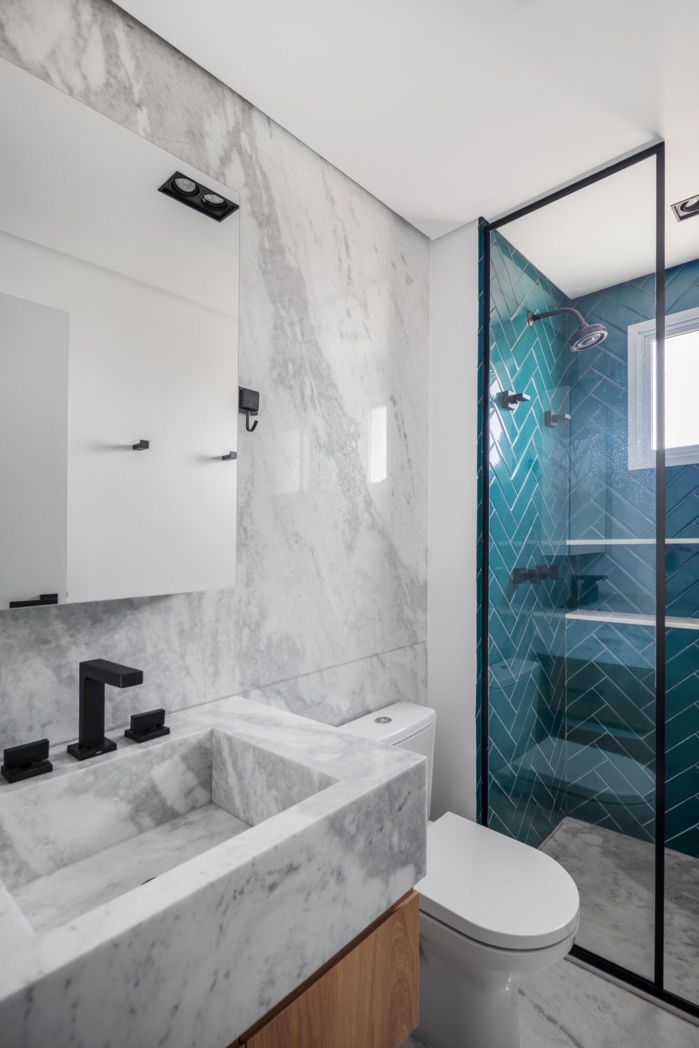 O banheiro da suíte combina revestimentos em mármore Paraná com marcenaria em tom amadeirado, solução que suaviza a frieza da pedra. Nas paredes do box, peças instaladas no formato escama de peixe introduzem textura e volumetria, acrescentando personalidade ao espaço.