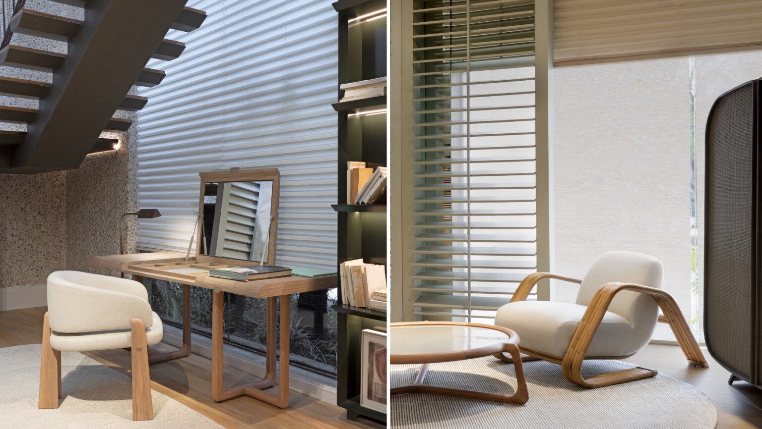 Composta por módulos, mesas, cadeiras, poltronas, banquetas, móvel-bar e buffets, entre outras peças, a coleção aposta no equilíbrio entre proporções puras, curvas precisas e materiais nobres. Os acabamentos artesanais e os volumes esculpidos valorizam a madeira, o tecido e o metal com um olhar atual, mas sem abrir mão da elegância clássica. O resultado é mobiliário versátil que se adapta com naturalidade a casas de praia, campo, montanha ou cidade, respeitando a personalidade de cada ambiente.