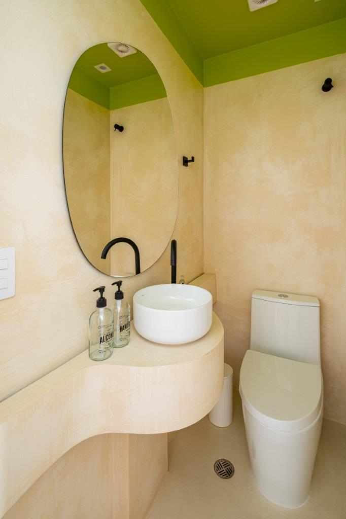 Banheiros com revestimento monolítico e lavabo ousado