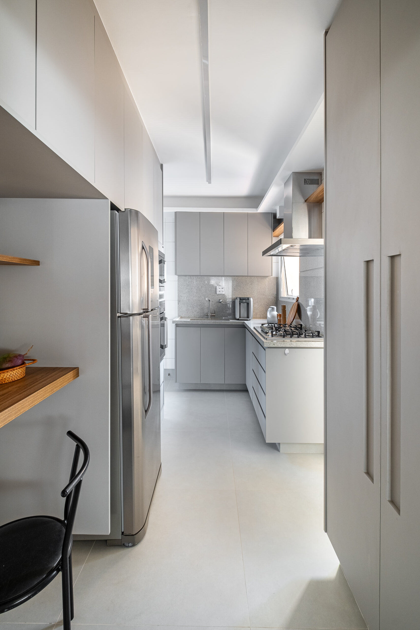 A cozinha foi completamente reconfigurada, com bancadas em materiais duráveis e armários novos, garantindo um layout mais eficiente. A área de serviço também foi reformulada, otimizando o espaço e oferecendo novas soluções de armazenamento.