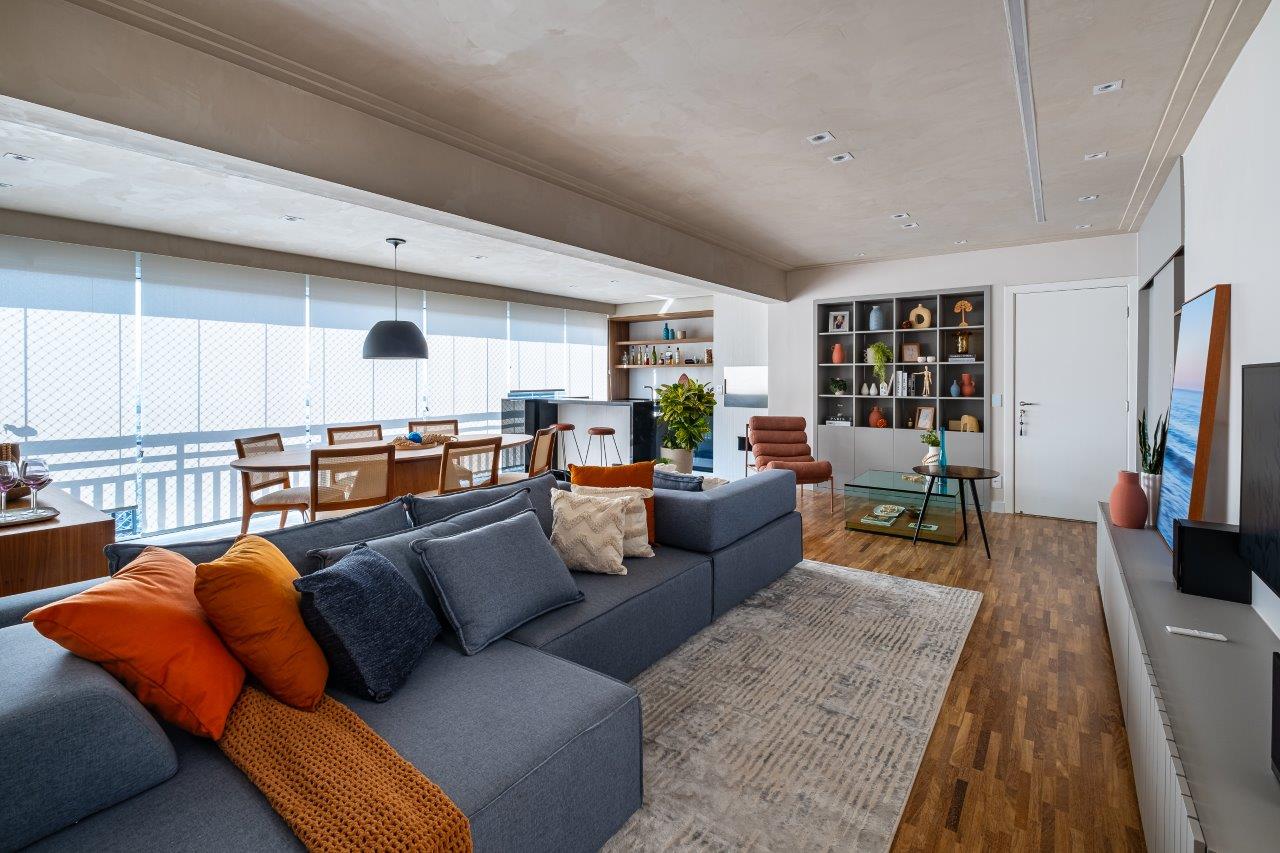 O piso original da sala, em assoalho de madeira, foi restaurado, trazendo leveza e um toque contemporâneo sem perder o aconchego da madeira. A paleta de cores neutra, com destaque para o cinza quente e toques de laranja, roxo e turquesa, confere personalidade ao projeto. A iluminação, planejada com perfis de LED embutidos e spots direcionáveis, cria diferentes cenários para cada momento do dia.