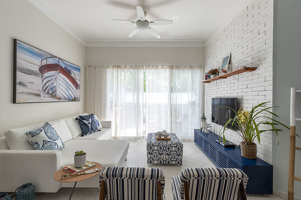 Na composição dessa sala de estar, a arquiteta Carina Dal Fabbro voou longe para trazer as cores muito presentes no litoral da Grécia: o azul no mobiliário e itens decorativos e o branco presente, em especial, na parede de tijolinhos| Foto: Rafael Renzo