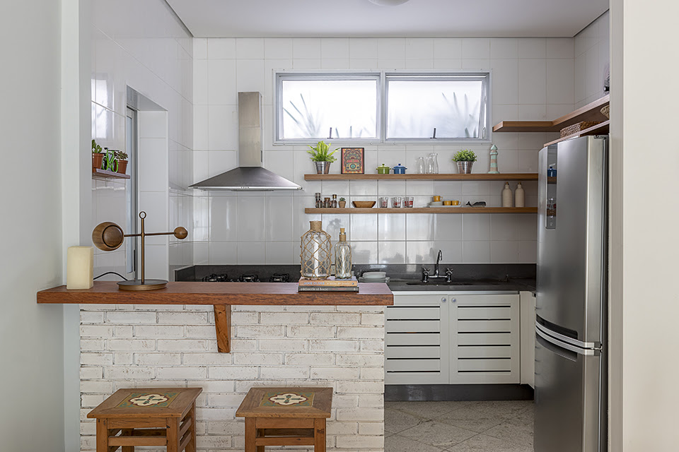 Na cozinha, o balcão americano realizado pela arquiteta Carina Dal Fabbro eleva a descontração que um apto de praia requer. E ao invés de grandes armários superiores, as prateleiras cumprem perfeitamente a função de deixar tudo no seu devido lugar | Fotos: Rafael Renzo