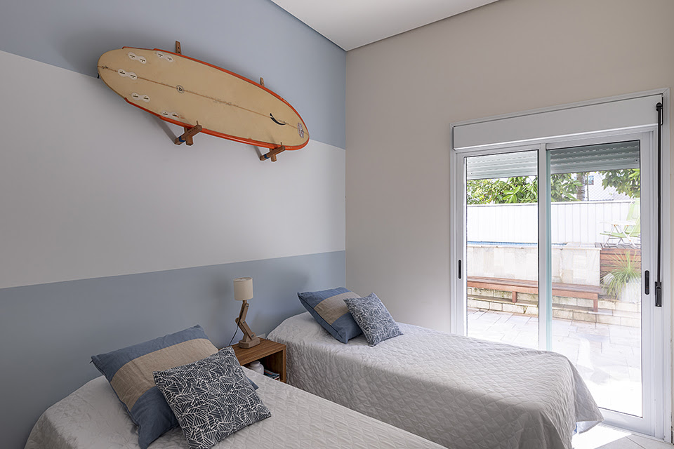 Com a prancha de surf pendurada na parede, o quarto deixou evidente a paixão do jovem pelo mar. Por não ser a morada principal dos moradores, a pintura em faixas decora a parede e elimina a presença de uma cabeceira| Foto: Rafael Renzo