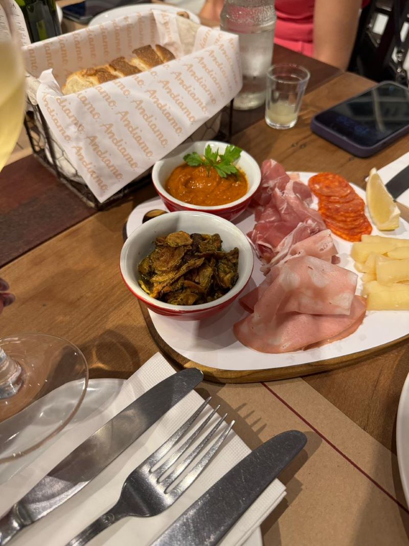 O cardápio do Andiamo é extenso e oferece opções para todos os gostos. Entre os destaques, estão as entradas deliciosas como o Antipasto Andiamo: burrata com tomate temperado, pesto e pinoli. Acompanha abobrinha marinada, presunto cru, mortadela, salame pepperoni, queijo parmesão, sardela. Servidos com pão italiano, azeite e manteiga temperados. E o carpaccio de carne com parmesão, molho de mostarda e alcaparras.