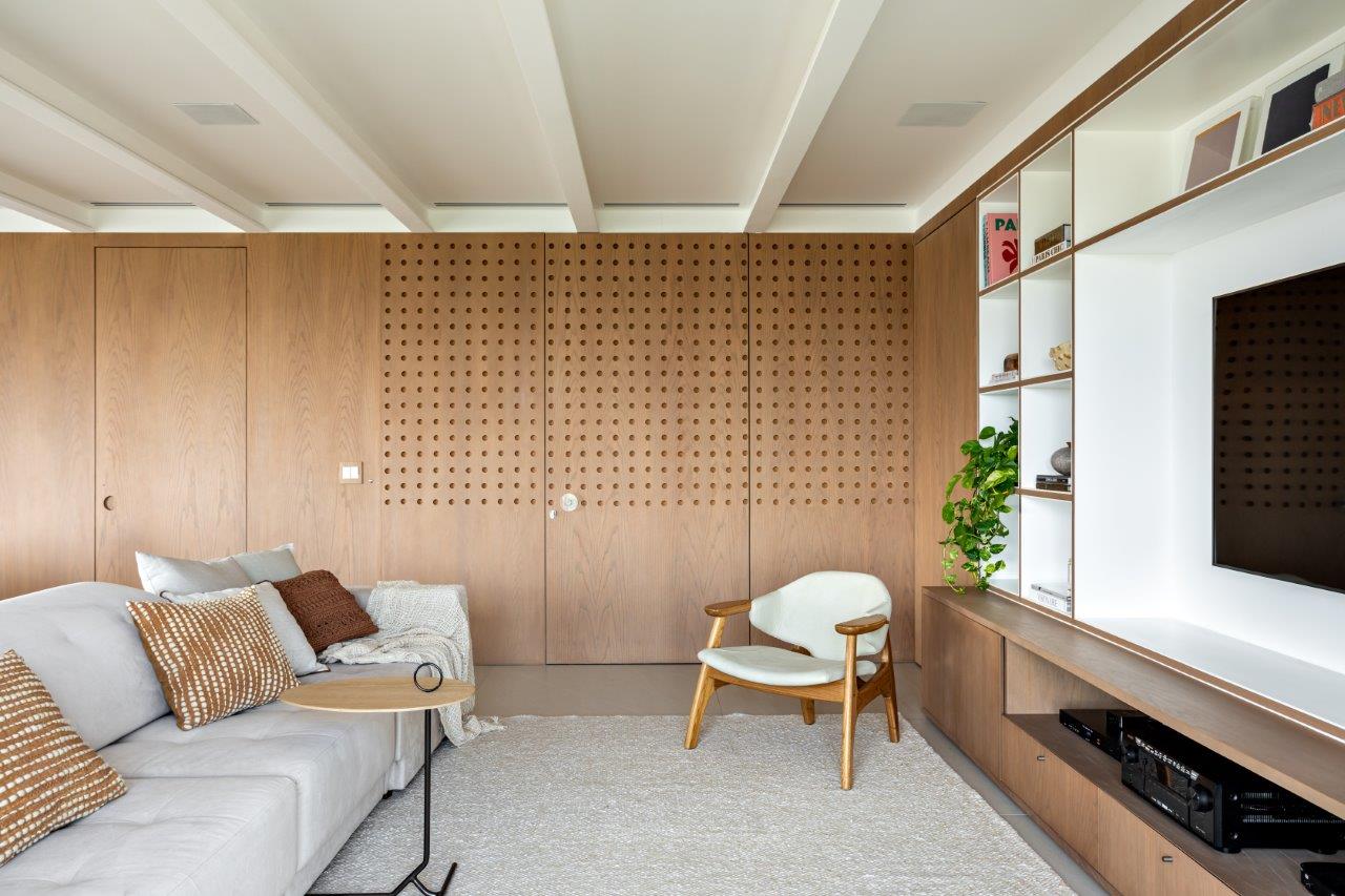 As salas de estar, jantar e TV se integram visualmente, mas cada uma mantém sua identidade funcional. A cozinha, toda recortada e cheia de ângulos, ganhou um layout impecável, enquanto as varandas se unem para criar um espaço gourmet aconchegante e convidativo, delimitado por um banco-floreira que preserva a atmosfera externa.
