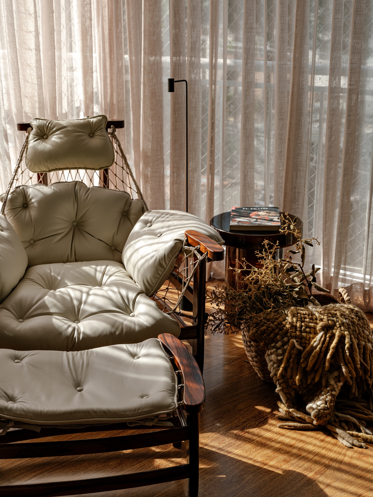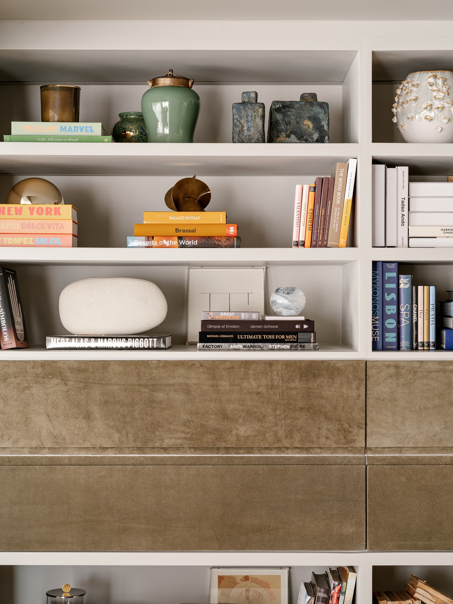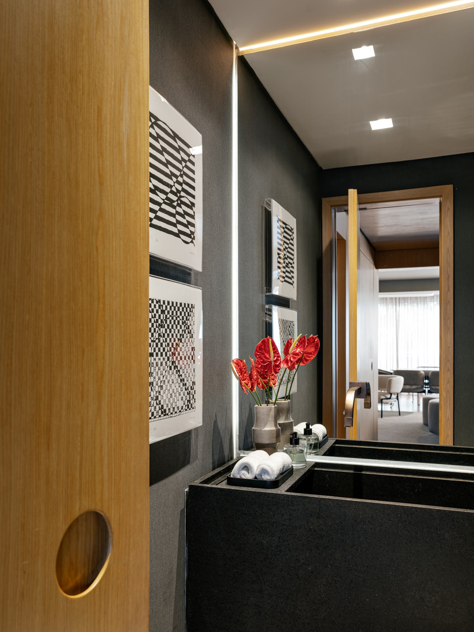 Outro ponto marcante é a valorização de objetos com significado afetivo. Um cristaleiro reinterpretado abriga taças herdadas da família, estabelecendo uma conexão entre passado e presente. A identidade do apartamento também se constrói por meio de peças de design brasileiro, como a poltrona de Jorge Zalszupin, a poltrona de Jader Almeida, objetos da RC Objeto, além de obras do artista Will e uma mesa escultórica assinada por Lucas Recchia.
