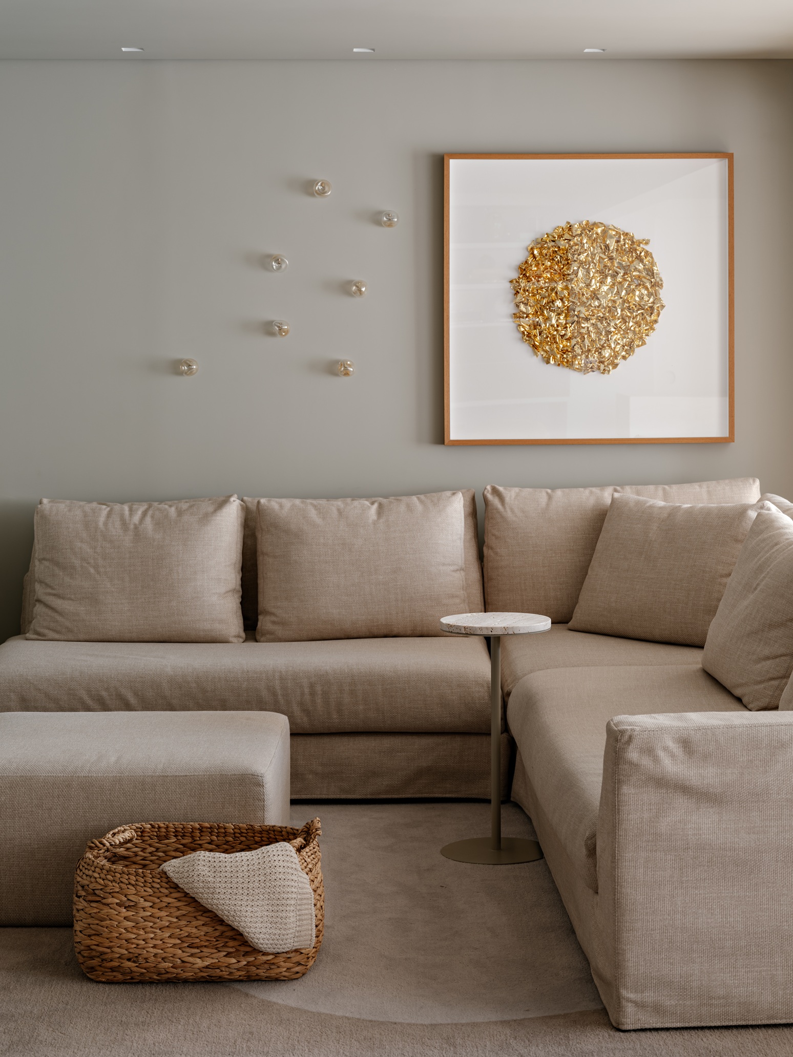 A principal intervenção foi a incorporação total da varanda ao espaço interno, solução que ampliou a percepção de área e permitiu a criação de um ambiente contínuo que reúne living, jantar, home e área gourmet. A integração não apenas favoreceu a circulação, mas também trouxe uma sensação de unidade visual, reforçada pelo uso de pufes de formas orgânicas que funcionam como elementos de transição, delimitando os usos sem recorrer a barreiras físicas.
