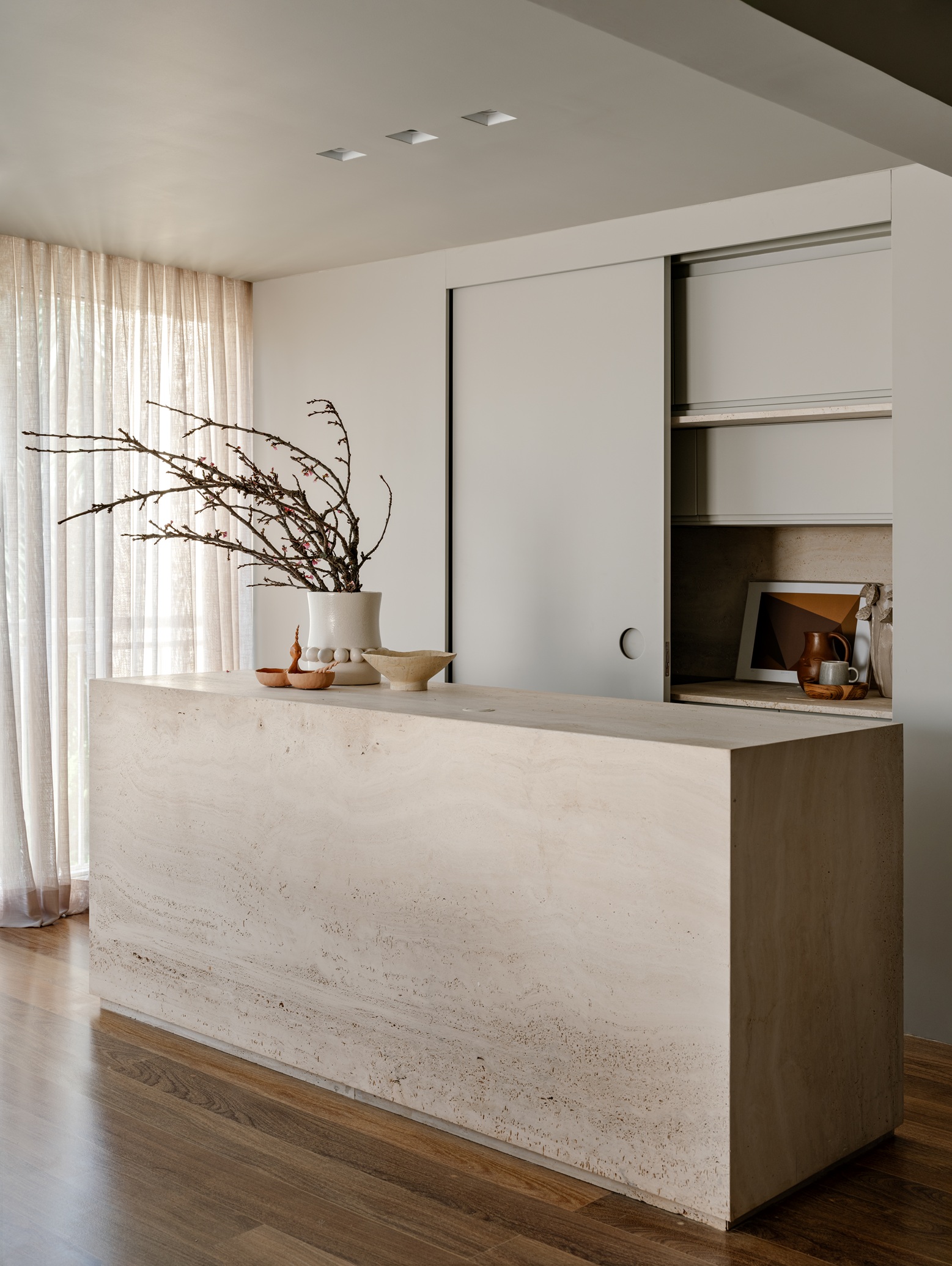 O projeto aposta em uma linguagem contemporânea guiada pelo conforto e pela valorização de materiais naturais. O piso de madeira existente foi preservado e estendido até a antiga varanda, dissolvendo os limites entre interior e exterior e criando continuidade visual. A base neutra, composta por tons de bege e madeira, foi pontuada por peças de destaque, como o tapete de desenho orgânico e o louceiro com portas revestidas em camurça verde, que acrescenta textura e personalidade ao ambiente.