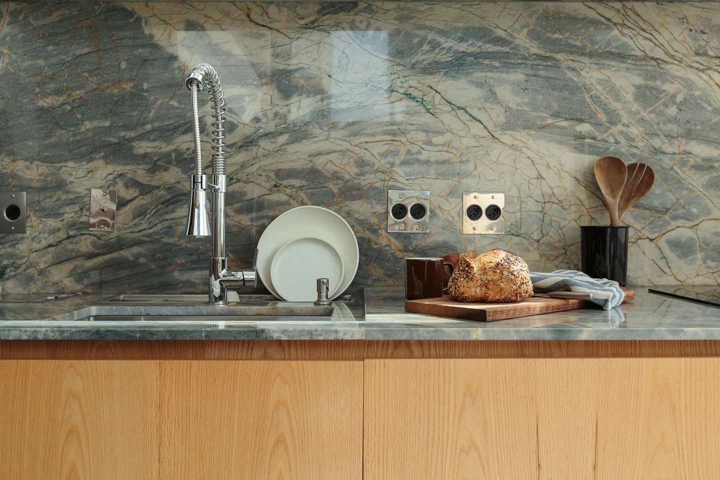 A cozinha, reposicionada junto à nova janela, aproveita ao máximo a iluminação natural e ganhou uma bancada funcional com monocomando Gourmet Celite cromado, que conquistou a moradora. “O chuveirinho é incrível. Consigo regar as plantas, encher o filtro e limpar tudo com muito mais liberdade”, conta Raquel.