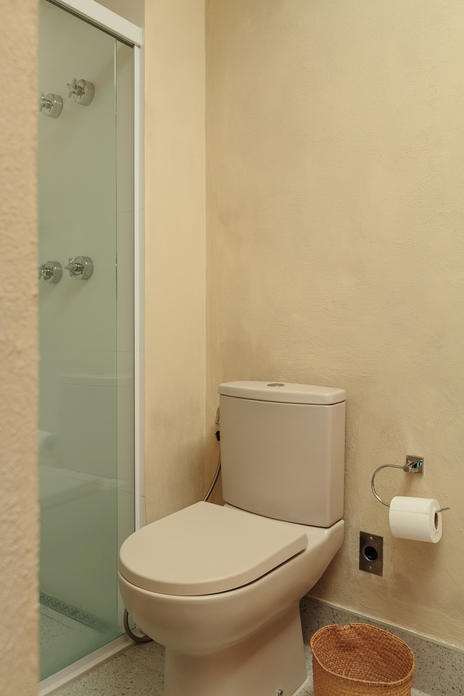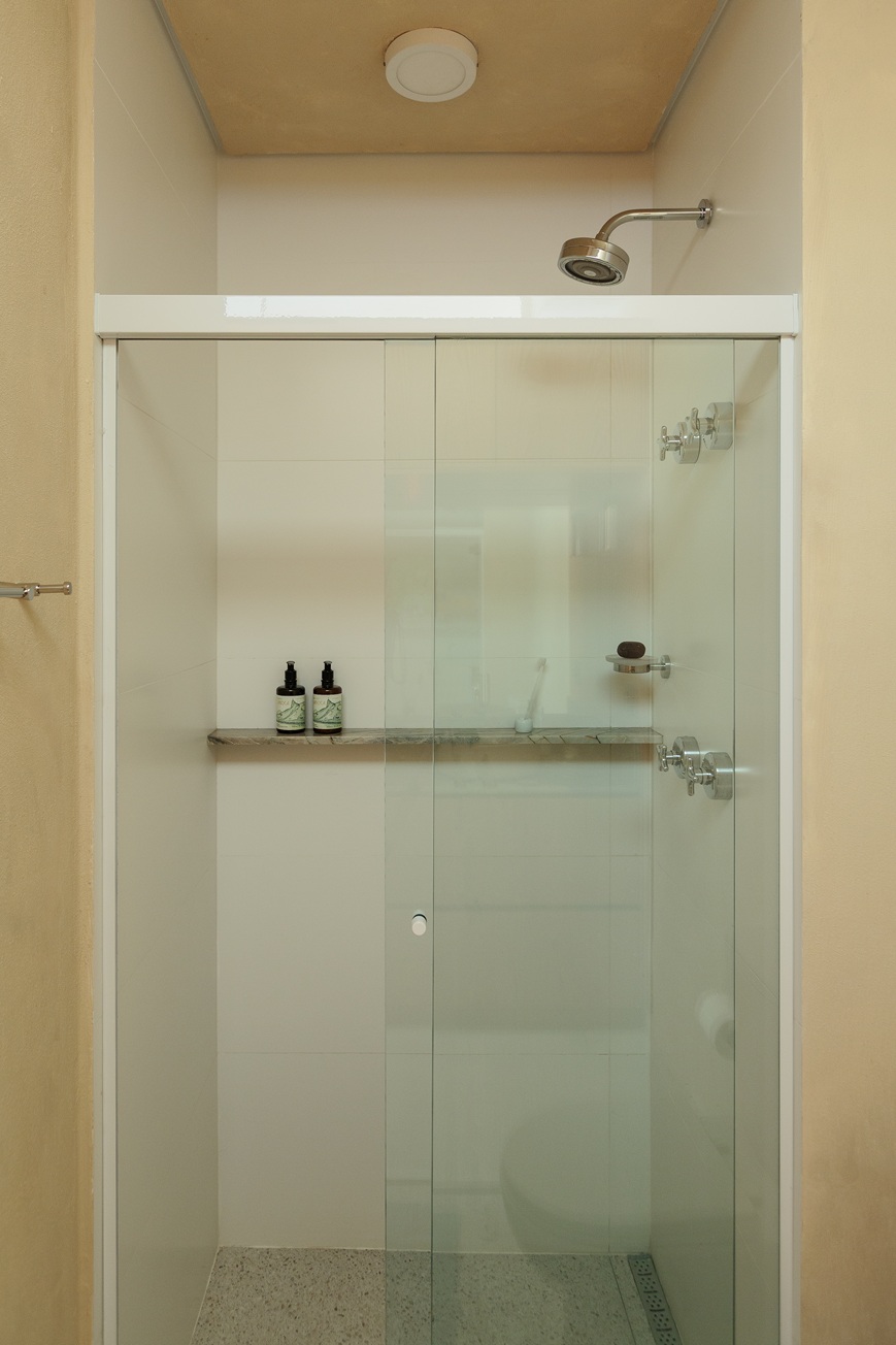No banheiro, a combinação da cuba de apoio Celite Slim na cor Beige, do monocomando Basic cromado e da bacia com caixa acoplada Smart cria uma estética clean, harmônica e acolhedora. O chuveiro Master Celite, com potência comparada à de hotéis, garante conforto diário. “Pensei em algo moderno, mas acabei escolhendo o clássico. O cromado encaixou perfeitamente com a pedra e os tons beges”, afirma.