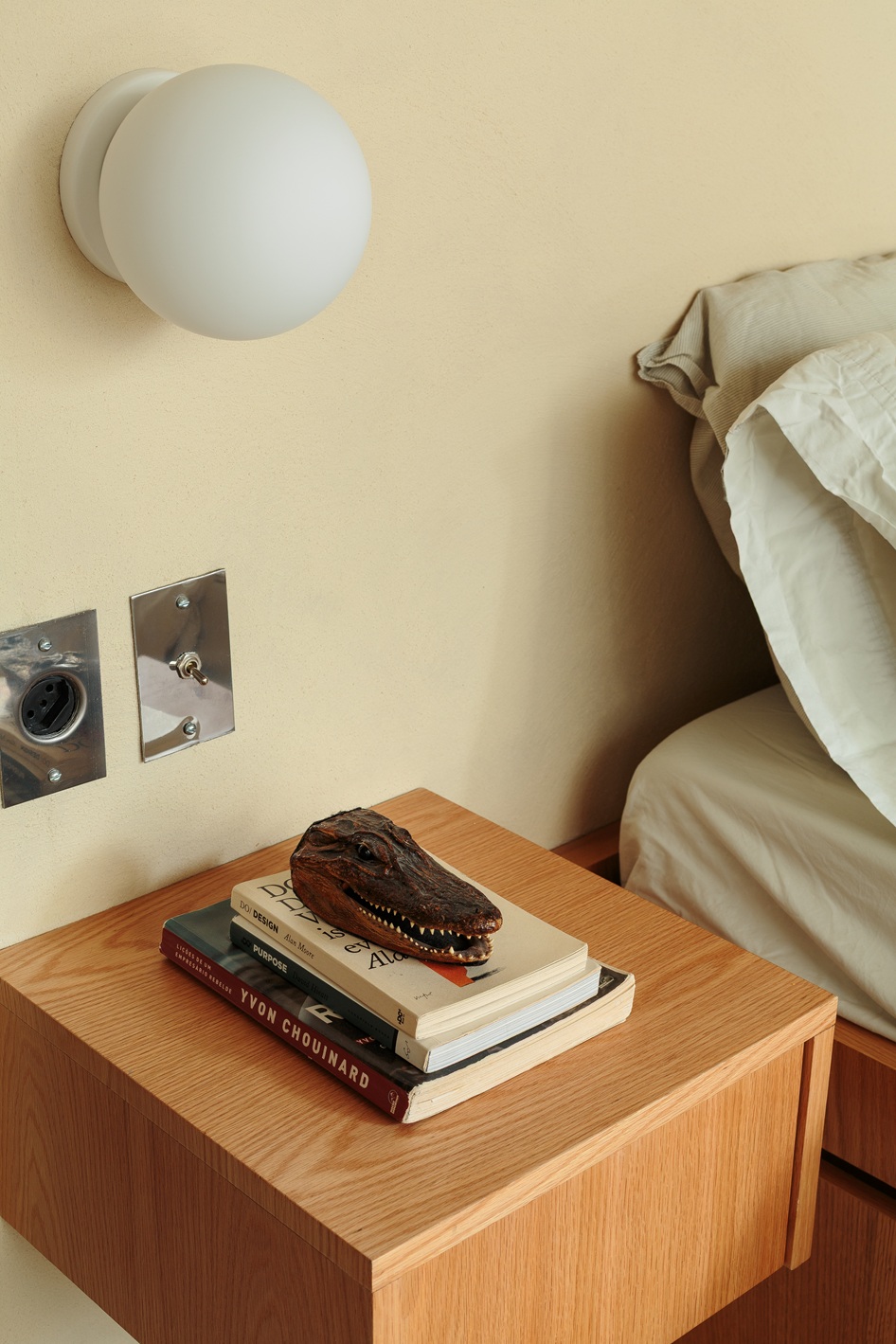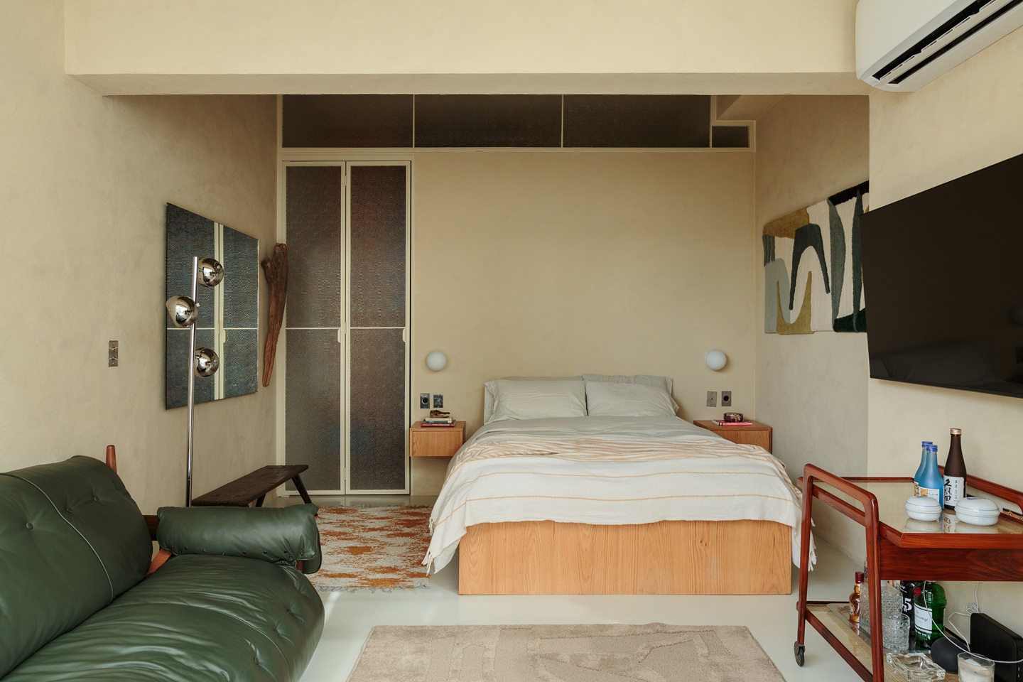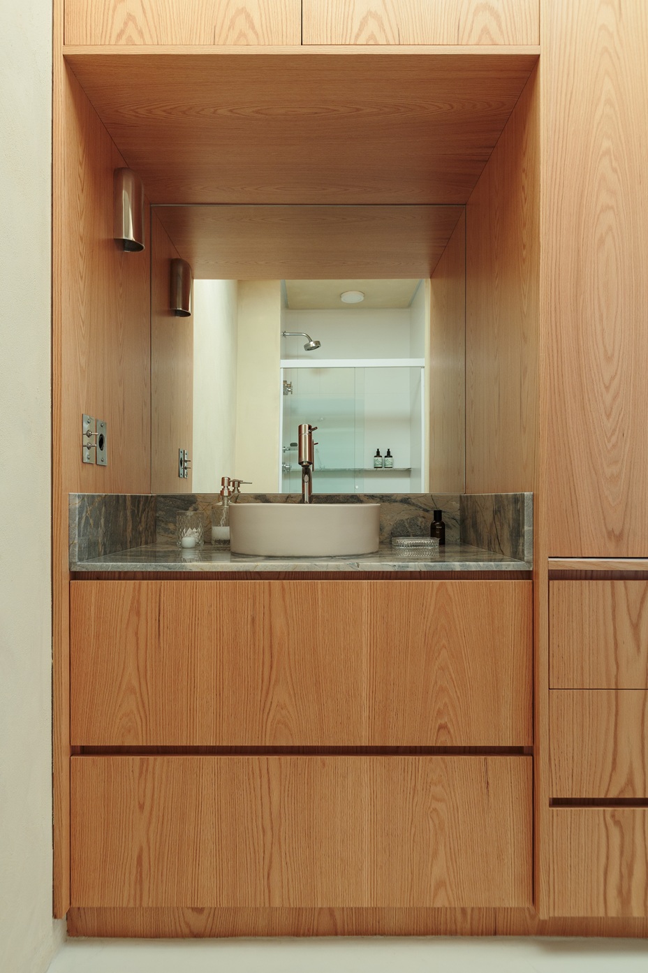 Um móvel multifuncional é o grande coringa da planta: de um lado, serve como bancada e armário para o banheiro; do outro, atua como cabeceira da cama, com arandelas e mesinhas laterais embutidas. Essa solução de marcenaria sob medida otimiza espaço e adiciona personalidade.
