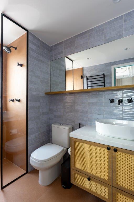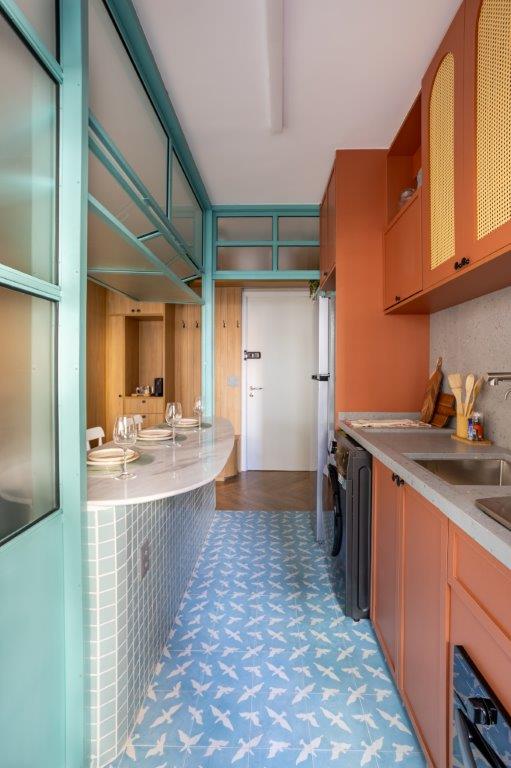 Na área do banheiro, o papel de parede com estampa de nuvens reforça o conceito de leveza e continuidade entre os elementos naturais que inspiraram o projeto. Já na cozinha, o olhar se detém nos detalhes da marcenaria em terracota, que dialoga com o piso estampado com pássaros — uma referência poética ao céu. A serralheria com vidro jateado garante versatilidade: pode permanecer aberta para ampliar o espaço ou fechada para criar um ambiente mais reservado.