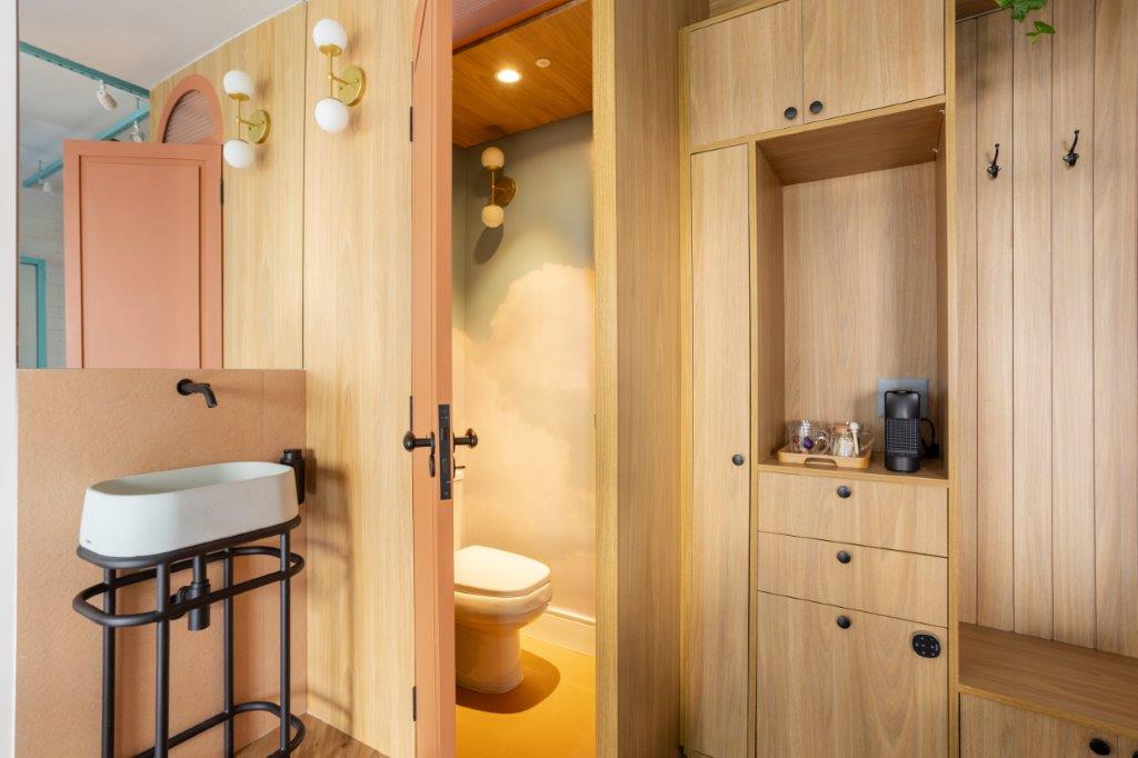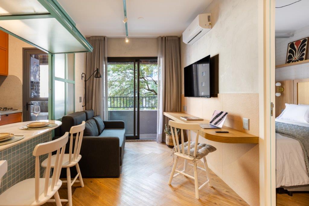 O projeto luminotécnico arremata o conjunto com uma proposta contemporânea. A iluminação indireta e aparente — sem o uso de forro ou gesso — traz um toque industrial e moderno, realçando texturas e volumes. O resultado é um espaço autoral e acolhedor, que transforma o morar temporário em uma experiência sensorial.