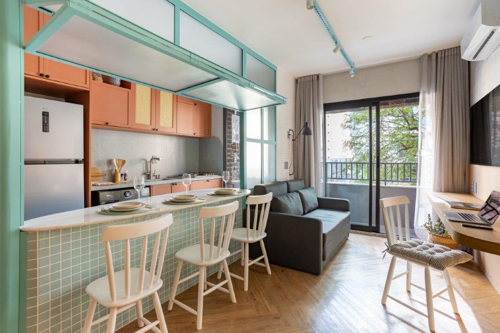 Com apenas 42 m², este apartamento localizado no coração de Moema, em São Paulo, prova que tamanho não é limite para o estilo. Adquirido para fins de investimento e projetado pela arquiteta Letícia Arcangeli, à frente do escritório Amarelo Rosa Arquitetura, o imóvel foi pensado para proporcionar uma experiência memorável aos hóspedes. O resultado é um espaço compacto, mas repleto de personalidade, que traduz a harmonia entre terra, céu e água.