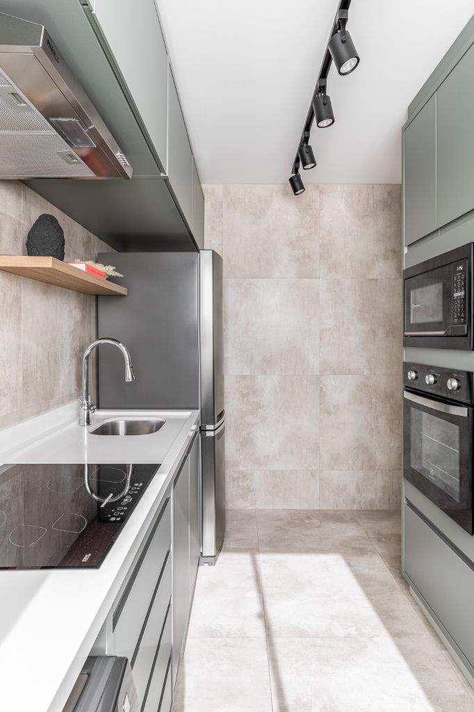 A cor verde foi incorporada na cozinha e em pontos estratégicos da pintura das paredes, transmitindo uma sensação de tranquilidade e renovação, além de criar um ambiente jovem, em sintonia com o perfil do casal. Essa escolha adiciona um toque de frescor e vitalidade ao espaço e reflete a energia vibrante e descontraída dos moradores.