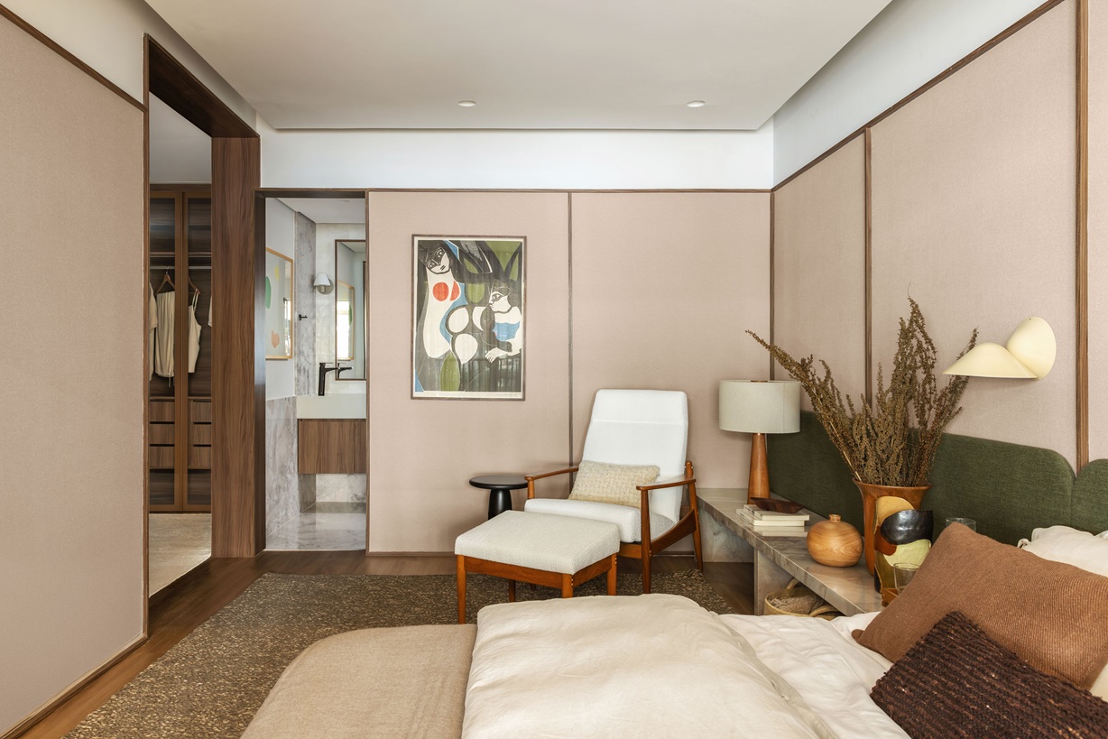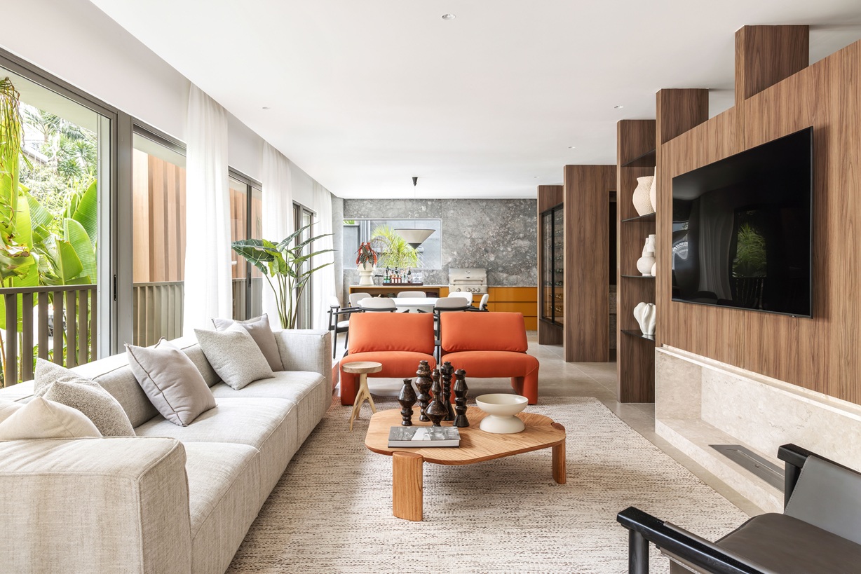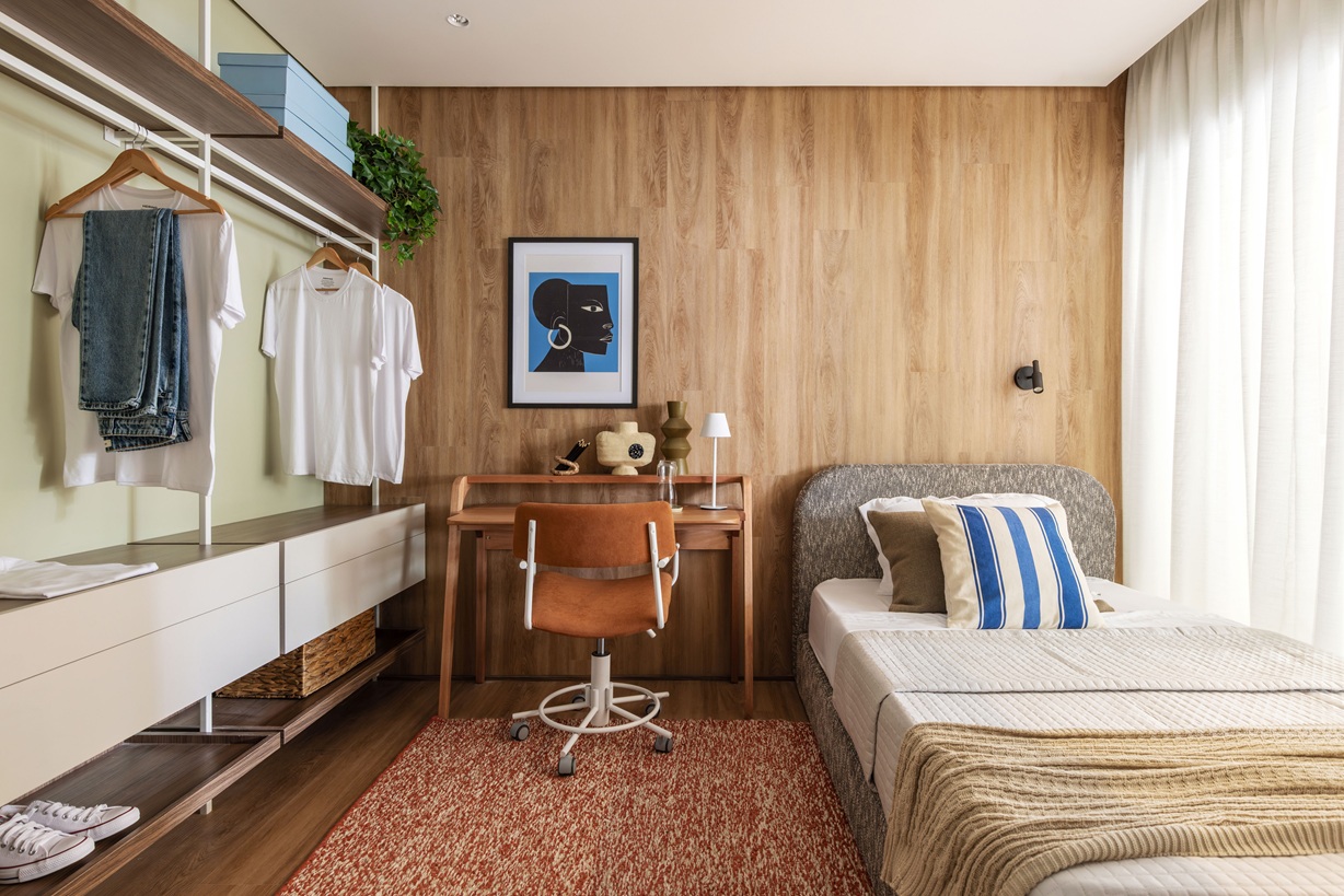 A paleta de cores passeia por tons de argila e terracota, com madeira natural revestindo parte da área social — criando unidade visual entre lavabo, cozinha, sala de jantar e quarto de hóspedes, que também pode funcionar como home office. Segundo Mauricio Arruda, arquiteto e sócio da Todos Arquitetura, a ideia foi “criar espaços humanizados, que permitam receber amigos, expandir a família e viver momentos únicos”.