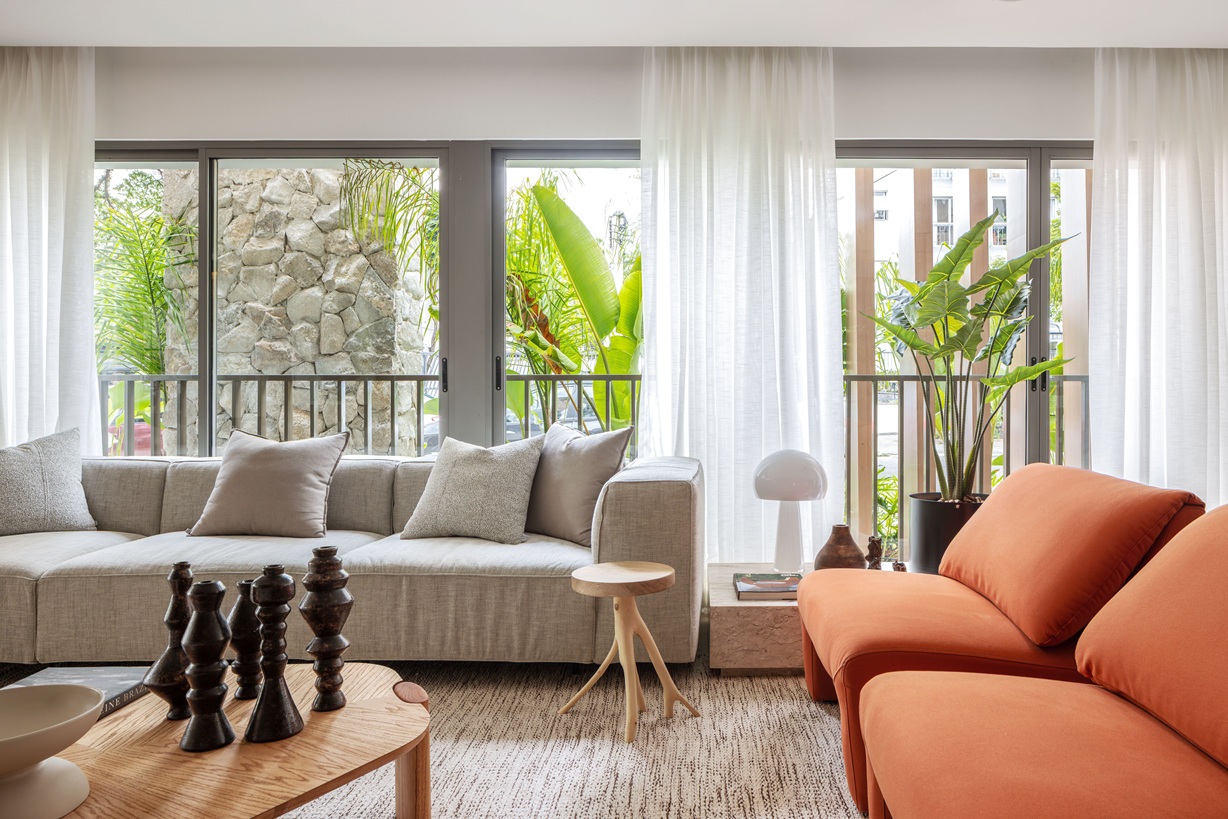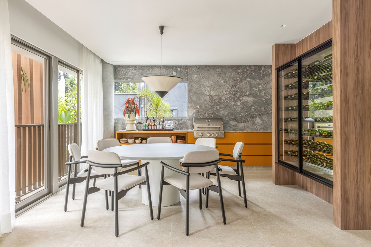 A brasilidade aparece no uso da madeira no mobiliário e em detalhes artesanais. Um dos pontos altos é o banco de mármore com queda d’água na ponta, peça escultural que combina sofisticação e serenidade.