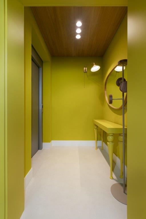 Reconhecida pelo domínio no uso das cores, Letícia Arcangeli aposta aqui em uma base neutra, pontuada por tonalidades estratégicas que conferem identidade ao projeto. O verde abacate marca o hall de entrada com personalidade, enquanto o azul do lavabo e o verde musgo na marcenaria da cozinha criam contrastes elegantes e contemporâneos.