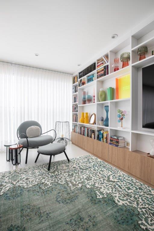 Com uma estética moderna e sofisticada, o projeto se destaca pelo uso criterioso de materiais e pela valorização de elementos sob medida. Um dos grandes protagonistas é a ilha da churrasqueira em granilite na cor Tiffany, que imprime personalidade e frescor ao ambiente. Na sala de estar, a estante planejada percorre toda a parede, desenhada especialmente para abrigar livros e objetos decorativos, reforçando o caráter acolhedor do lar.