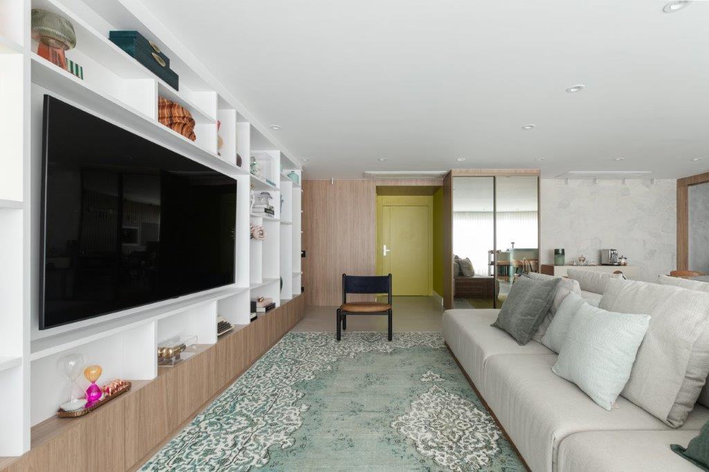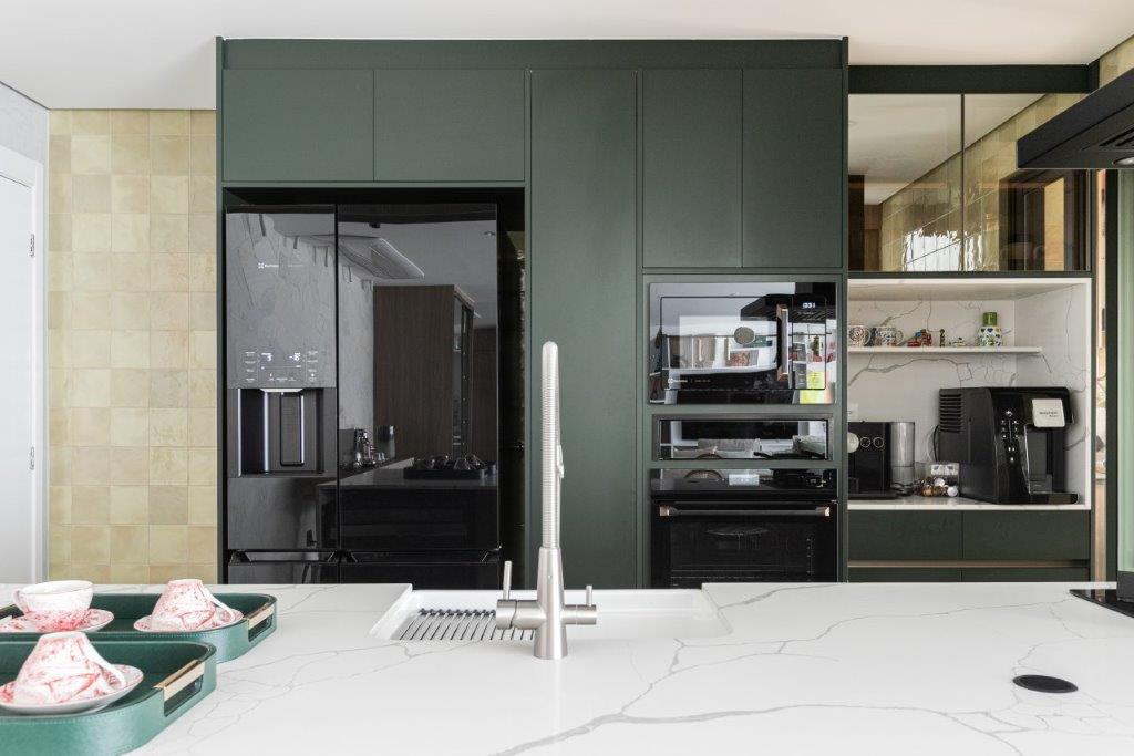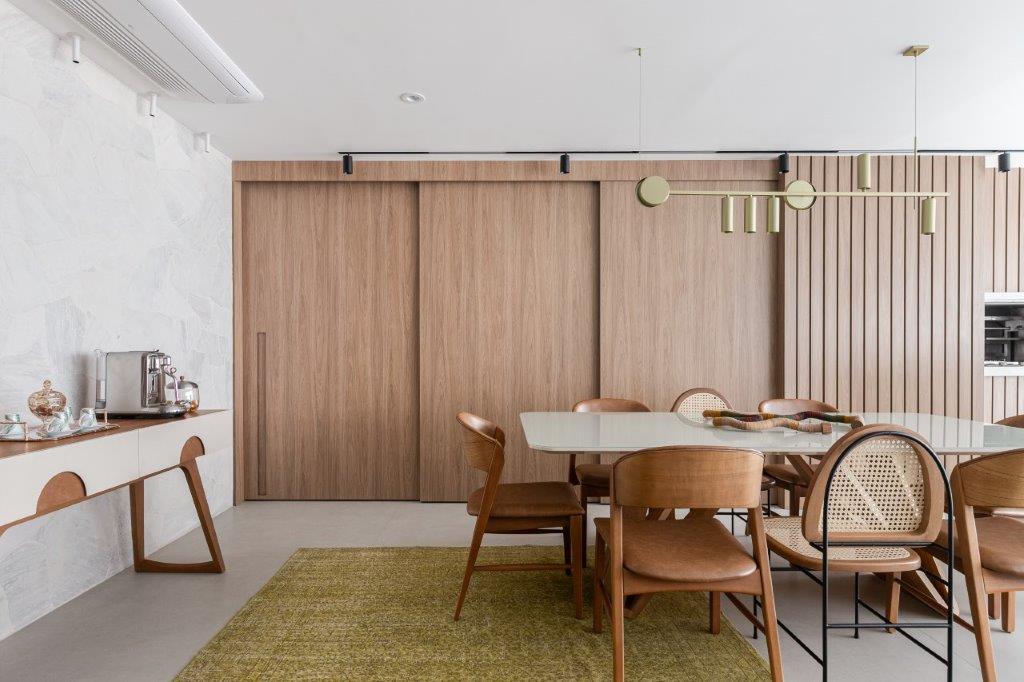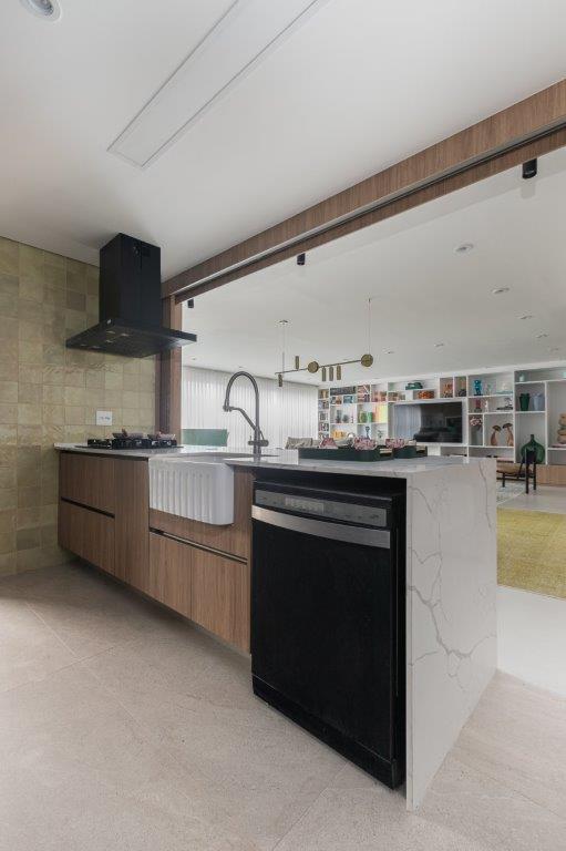 O conforto também é prioridade: o sofá em formato de ilha organiza o living de maneira funcional e aconchegante, favorecendo a convivência. Já a cozinha revela soluções versáteis, como a porta de correr em madeira, que permite isolar o ambiente quando necessário sem comprometer a estética. Outro destaque é a adega climatizada, que agrega sofisticação e praticidade ao dia a dia.