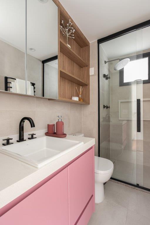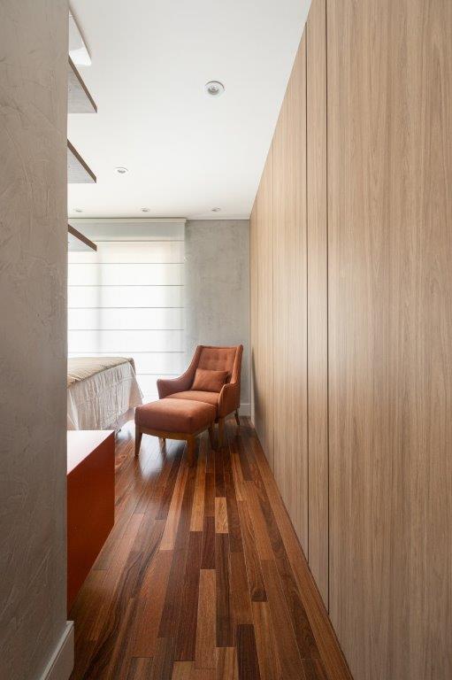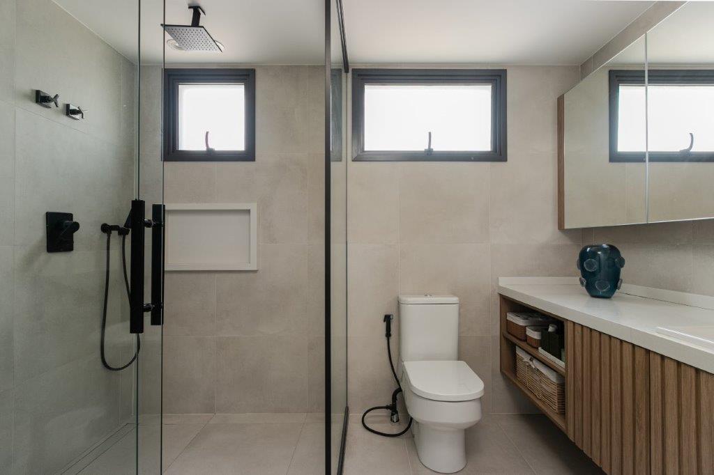 Nos acabamentos, a escolha por madeira, granilite e porcelanato reforça não apenas o apelo estético, mas também a praticidade, com materiais duráveis e de fácil manutenção — ideais para a rotina urbana.