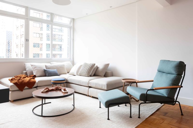 O mobiliário escolhido segue uma estética minimalista e atemporal, com cores neutras e claras que contribuíram para criar uma atmosfera aconchegante e leve.