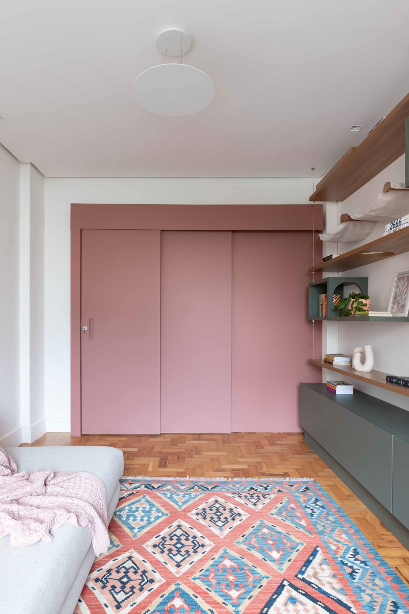 Uma escrivaninha existente foi integrada ao ambiente, e um sofá-cama foi adicionado, transformando o espaço em um quarto de visitas quando necessário.