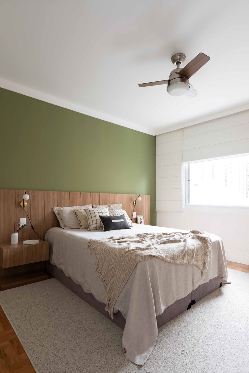 Para o quarto do casal foi aprimorado com uma cabeceira de cama feita sob medida em marcenaria. Uma parede verde tornou-se o ponto focal, acrescentando um toque de cor e vida ao ambiente.