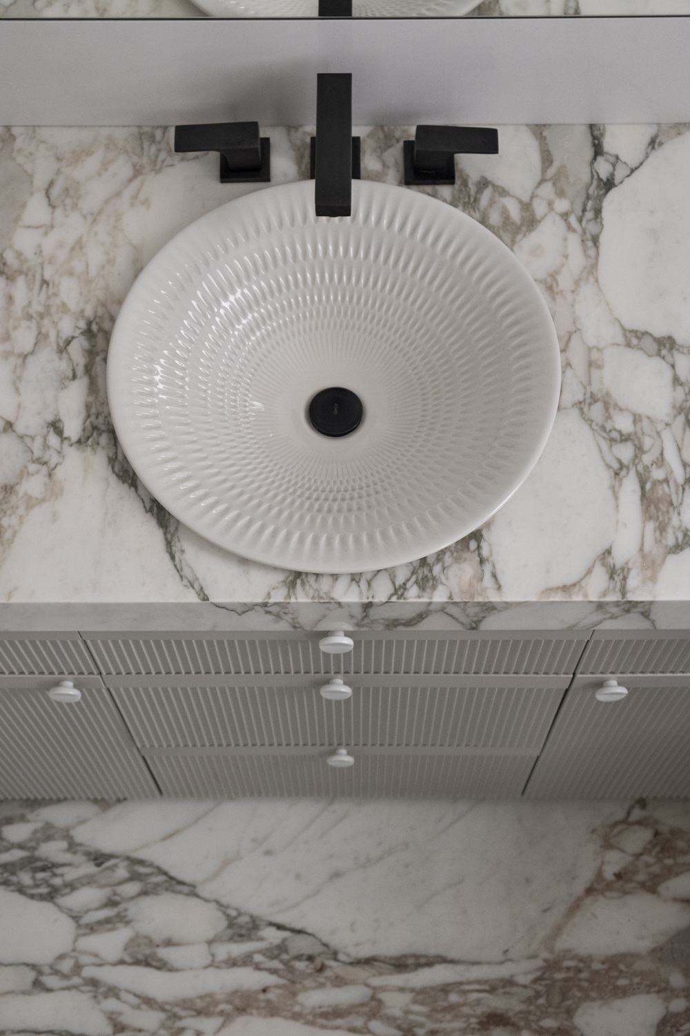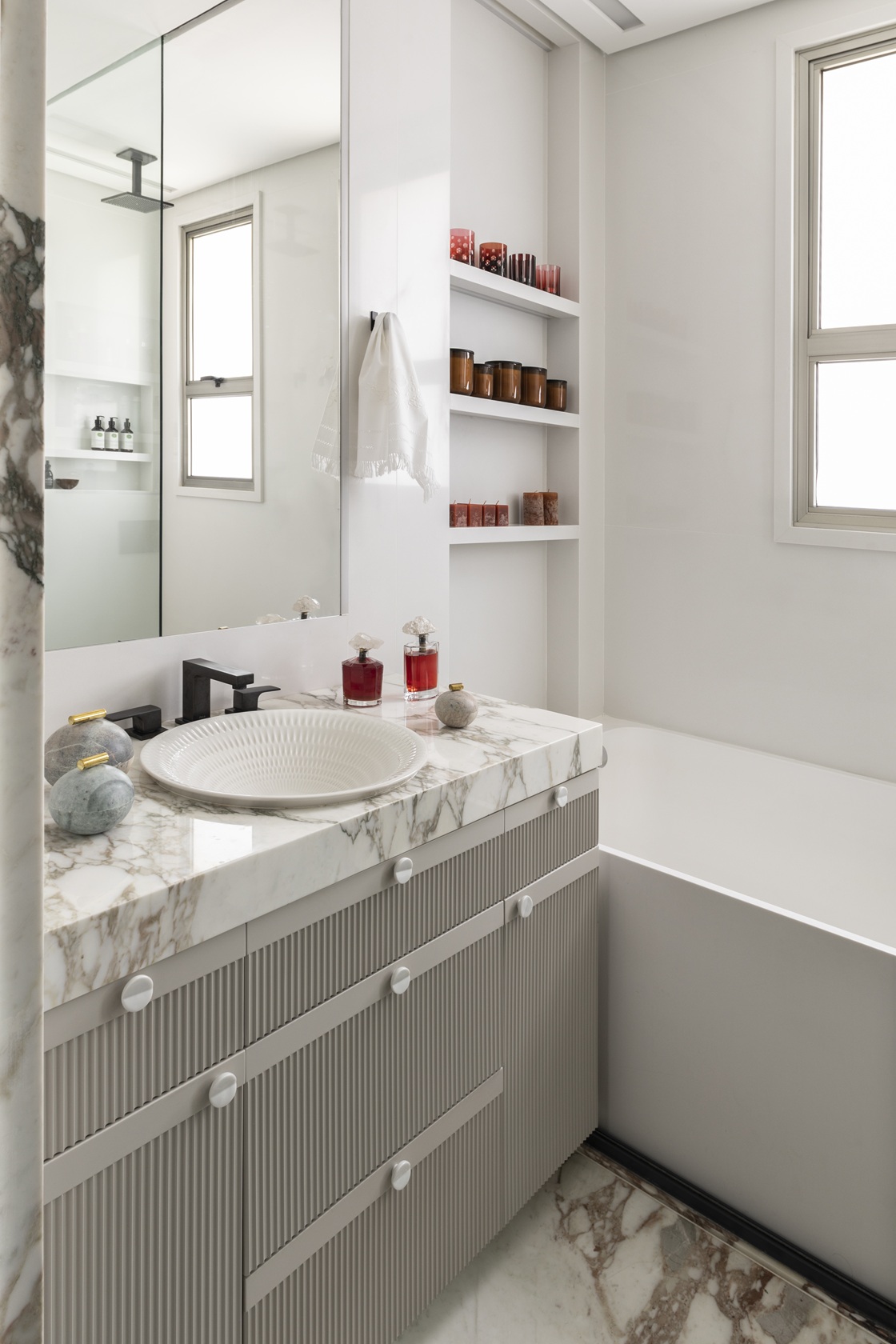 A mesa redonda com centro giratório na sala de jantar foi pensada para estimular a interação familiar. A base neutra do projeto ganha toques marcantes na marcenaria, criando uma atmosfera sofisticada e funcional. O pilar de mármore, integrado à parede, reforça a continuidade visual e o cuidado em cada detalhe.