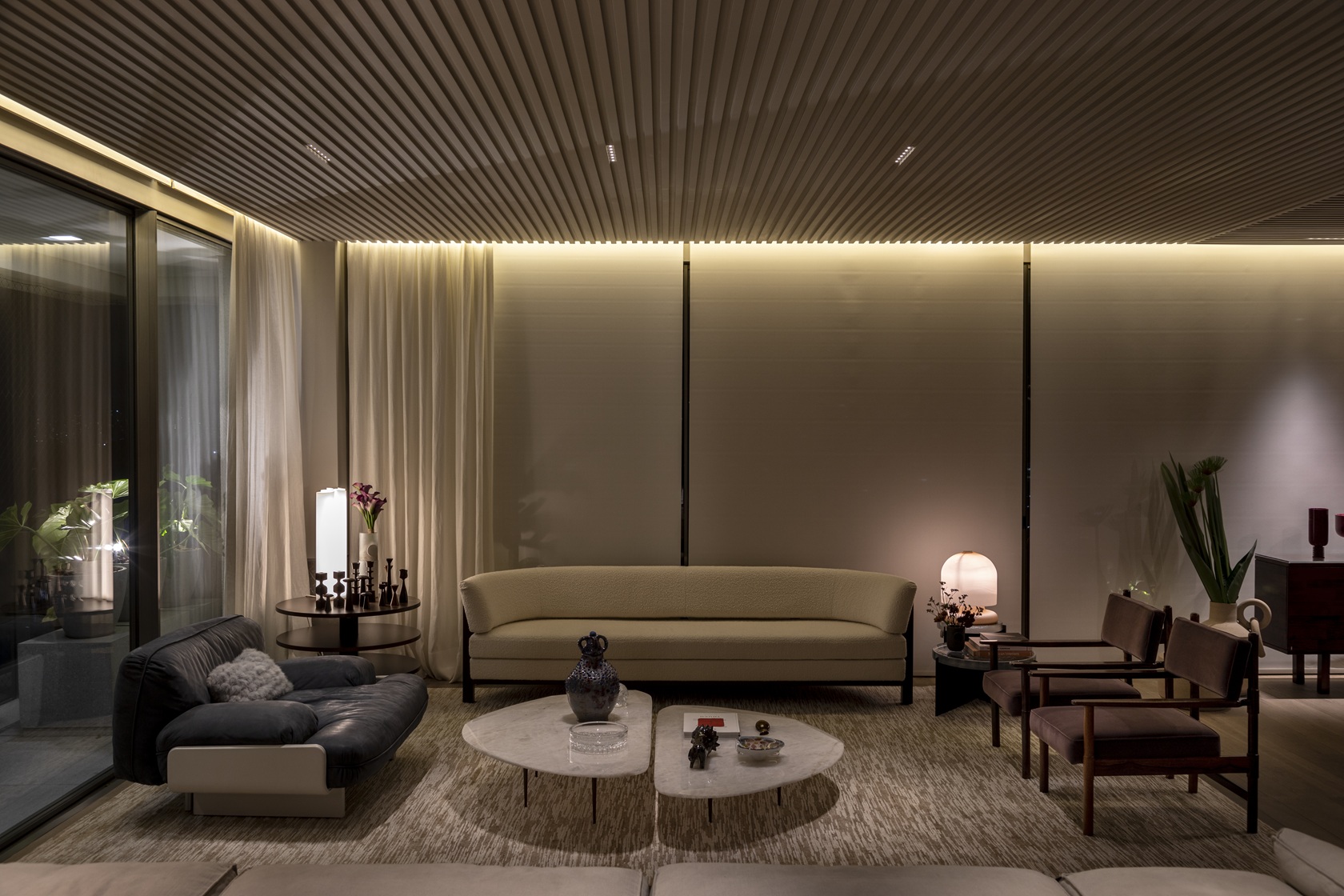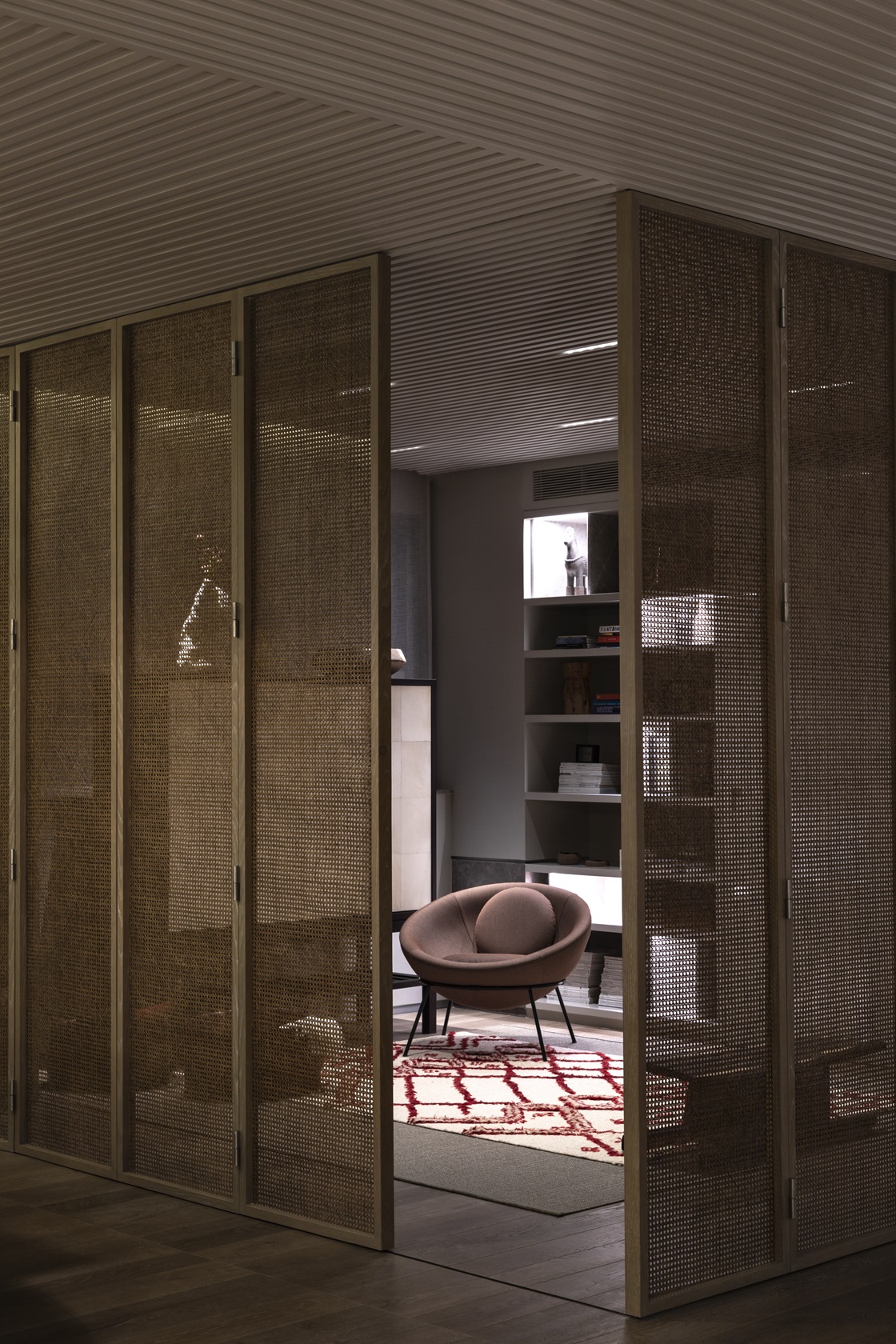 A marcenaria sob medida despontou como protagonista, organizando os espaços e conferindo uma sensação de aconchego. No living, o teto contínuo, com iluminação embutida entre ripas de madeira laqueada, demonstra a atenção aos detalhes e a busca por uma atmosfera suave e integrada.