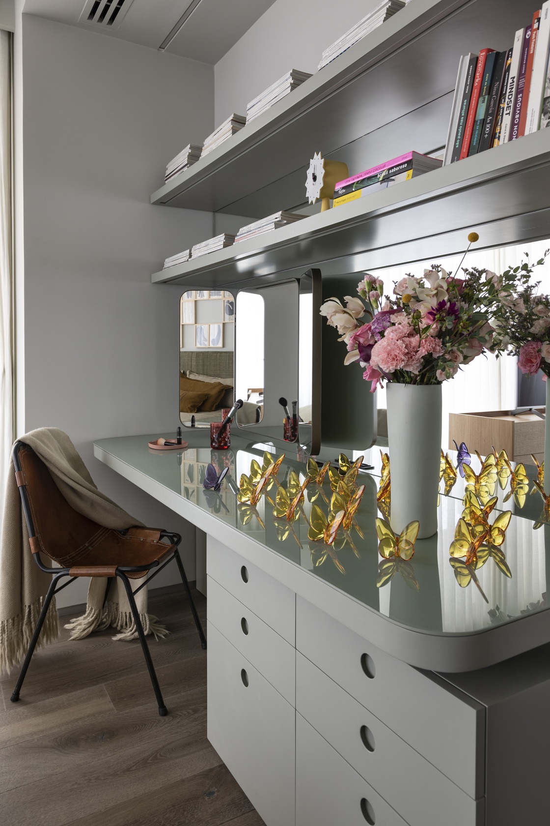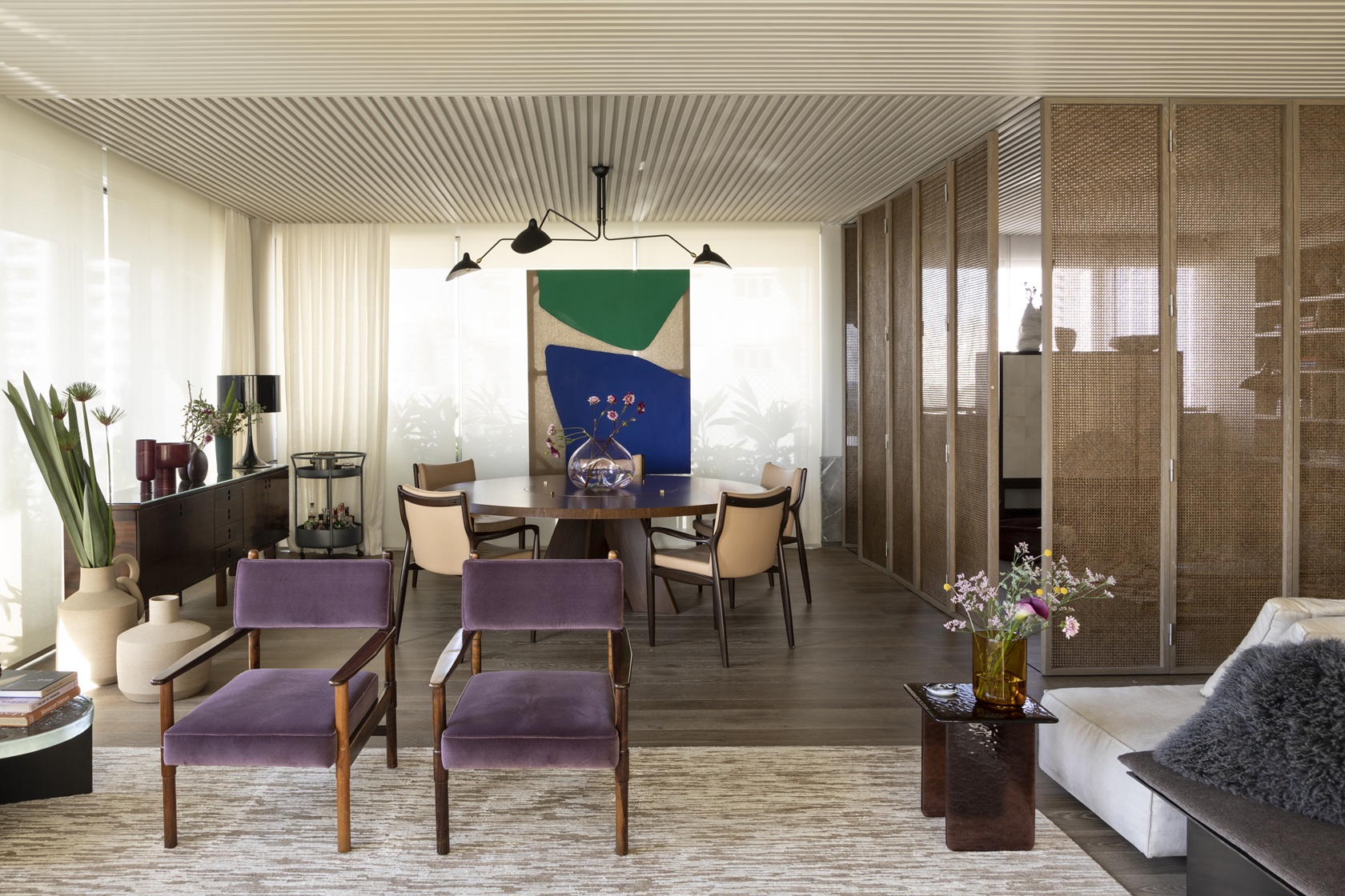 A arte também marca presença, com obras cuidadosamente selecionadas, como o quadro de Germana Monte-Mór na sala de jantar e o políptico de Luiz Martins na suíte master.