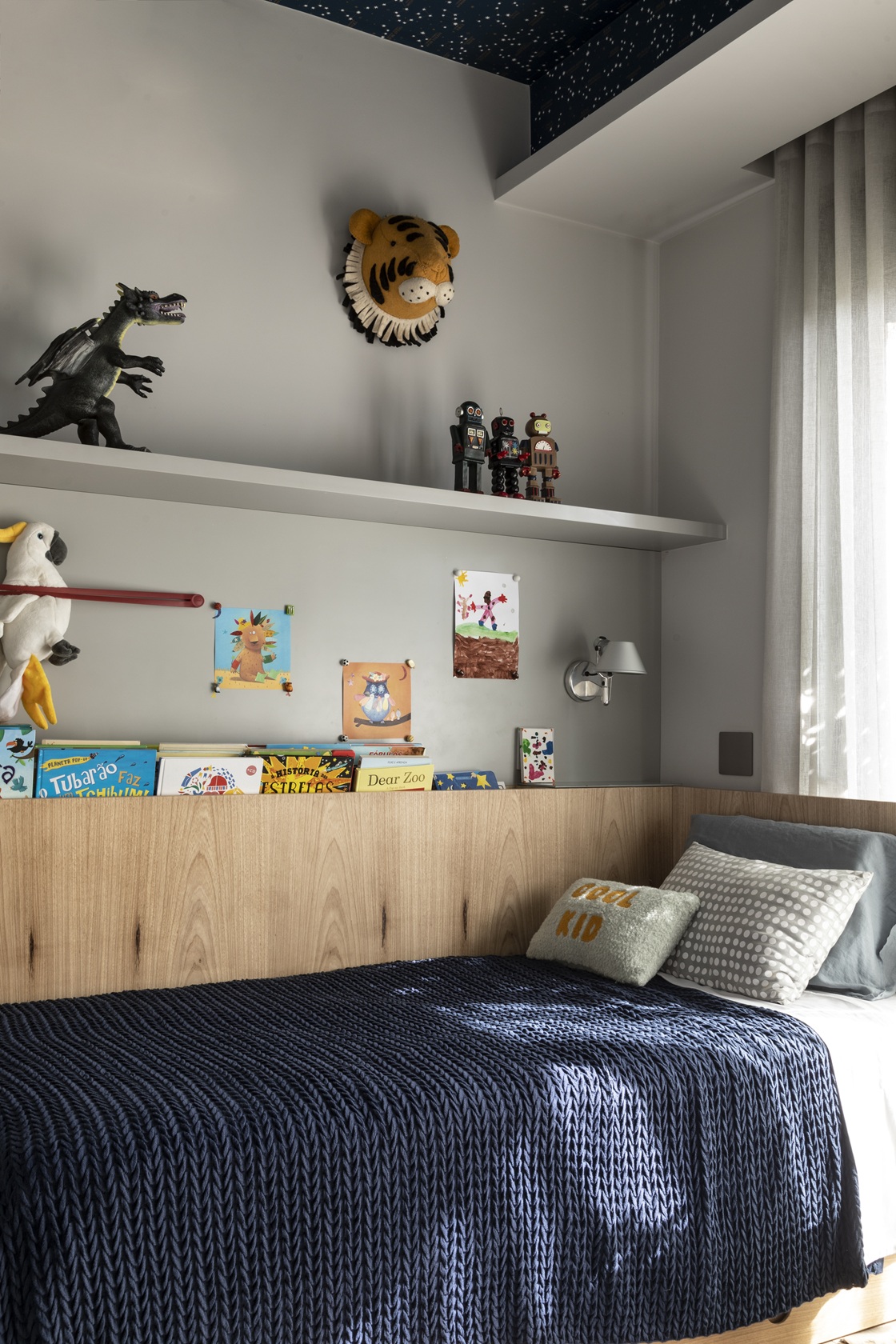 Outro destaque é a estante multifuncional, que foge do óbvio com nichos iluminados, detalhes em mármore e espaços dedicados a objetos de valor sentimental. Ao lado, uma porta de pergaminho esconde um cantinho secreto: inicialmente pensado como copa, o espaço se transformou em um refúgio para as crianças, com brinquedos organizados e uma TV embutida para os momentos de lazer.